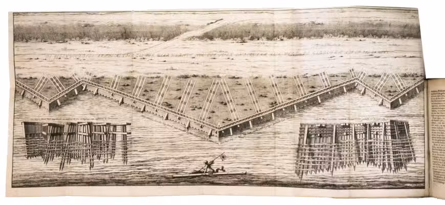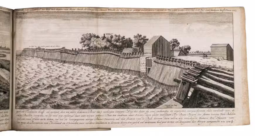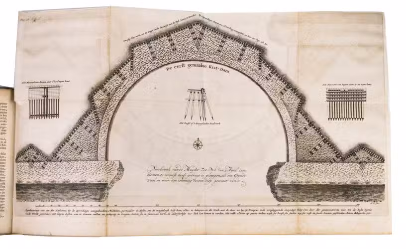 First edition of a rare work on dyke construction, illustrating the continuing battle of the Dutch against the sea. On April 5 1702, the dyke between Amsterdam and Muiden was breached, flooding the lands east of Amsterdam for the umpteenth time. Lawyer and notary Nicolaas Listingh (1630-1705) then designed a new construction to prevent the sand being washed away by the pounding of the waves. His ideas are thoroughly explained and illustrated in the present work, offering a fascinating insight into Dutch water management of the early 18th century.