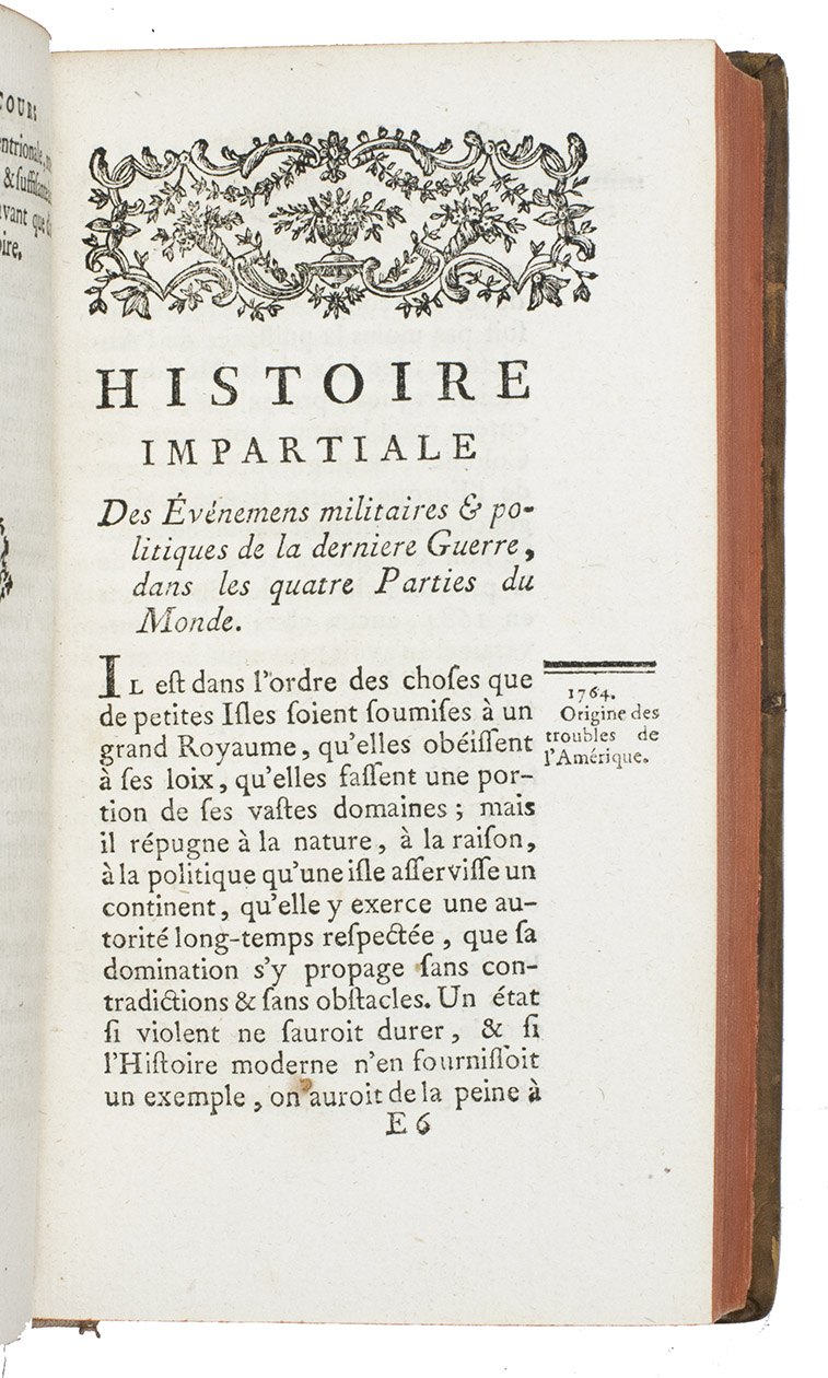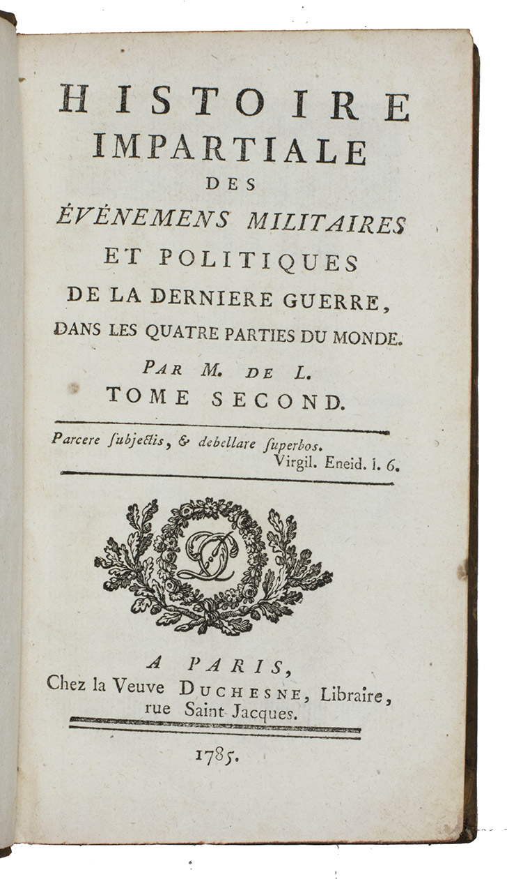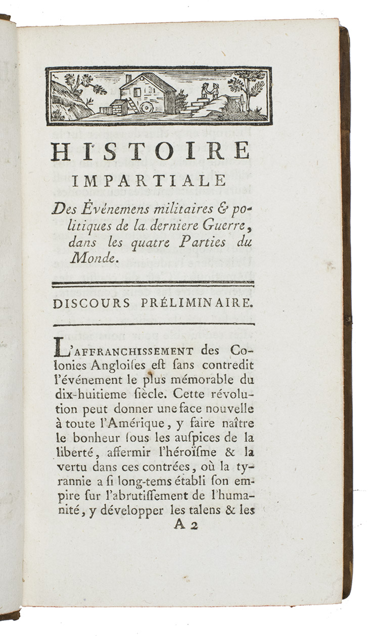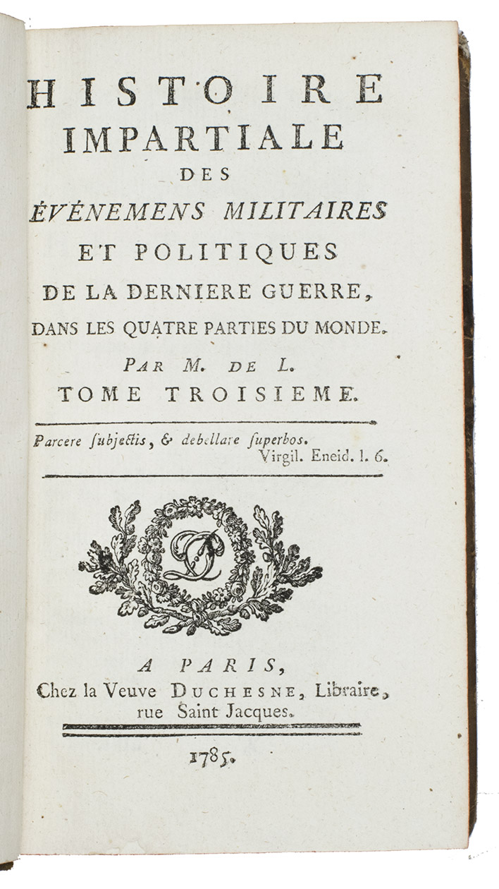 In addition to the war in the North American colonies, the book describes the French attacks on the English in the Caribbean, India and Gibraltar.Variant issue (with the year 1785 misprinted on the first title-page) of the original Paris edition of this famous and important history of the American Revolution by Pierre Charpentier de Longchamps (1740-1812). Another page-for-page reprint appeared in Amsterdam in the same year, followed by several other editions and translations, including a Spanish translation in 1793.
