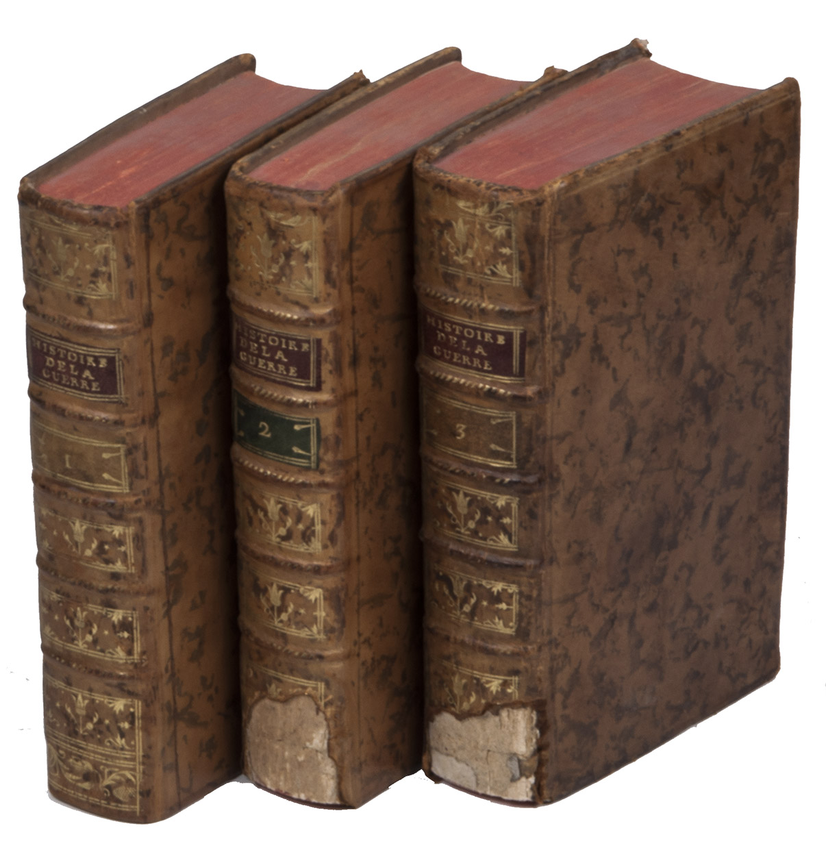 Paris, the widow of Duchesne, 1785. 3 volumes. 12mo. With Duchesnes woodcut publishers device (DC monogram in a wreath and accompanied by oak branches) and a different headpiece in each volume. Uniformly bound in contemporary mottled calf. 558, [2]; 523; [2], 620 pp.