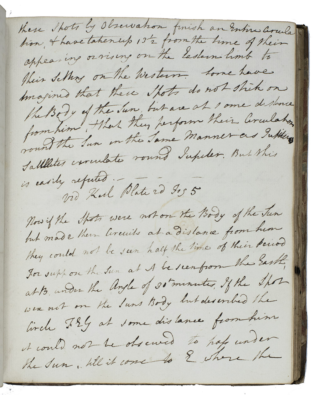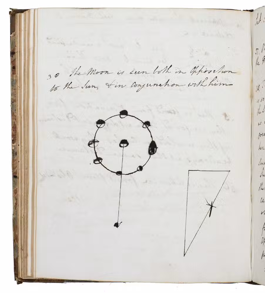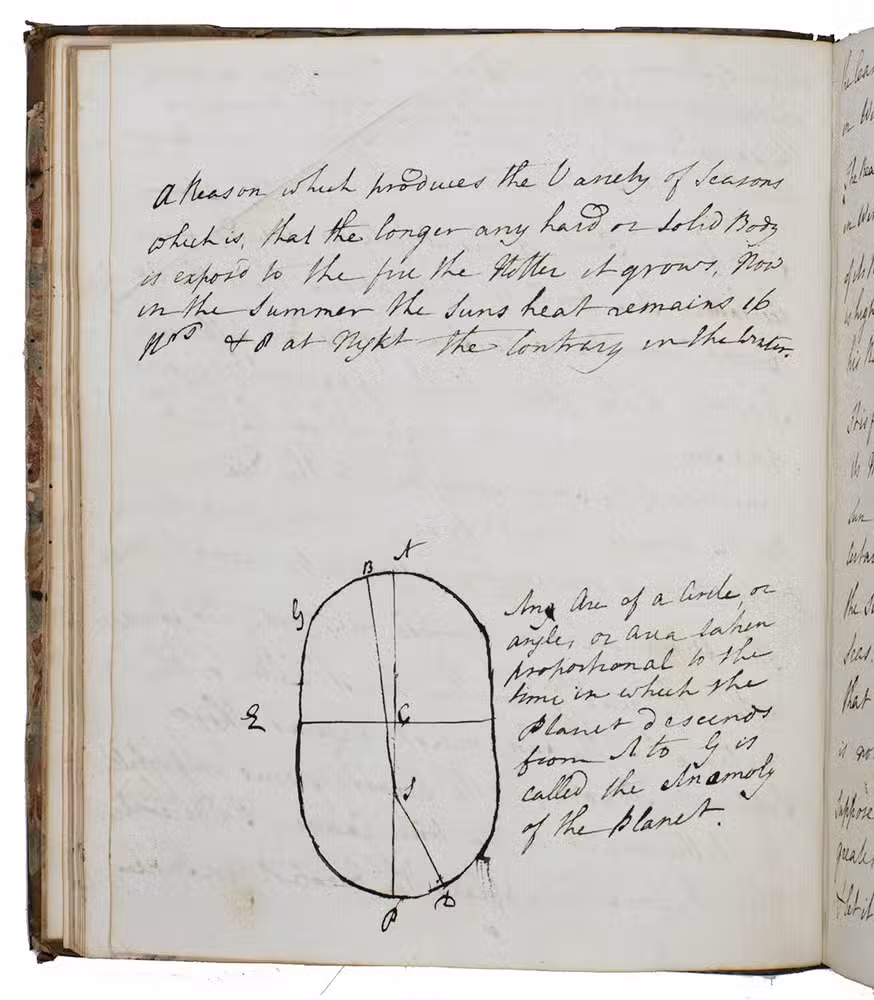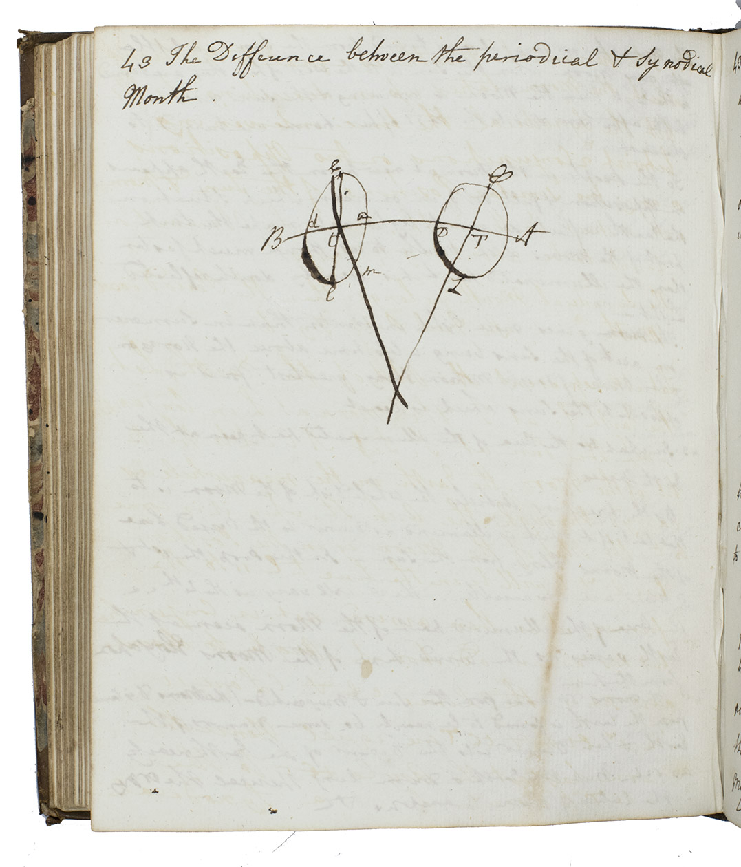 The manuscript appears to work through at least two different texts, beginning with Keills on astronomy. There is a section devoted to what is called the precession of the equinoxes (the westward drift of the points where the ecliptic and equator intersect, due to the precession of the earths axis) - the author notes that "Sir Isaac Newton has demonstrated that it arises from the broad spheroidal figure of the earth." The author then turns to sunspots and the arguments for and against their being on the surface of the sun. Then comes a long discussion of the planets: the planes and periods of their orbits, phases, conjunctions, retrograde motions, apparent brightness, and their distances from the sun.