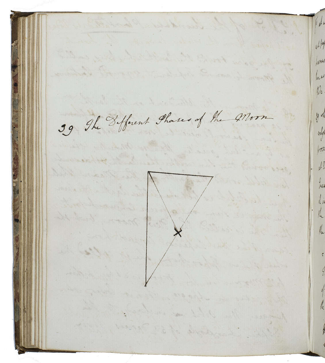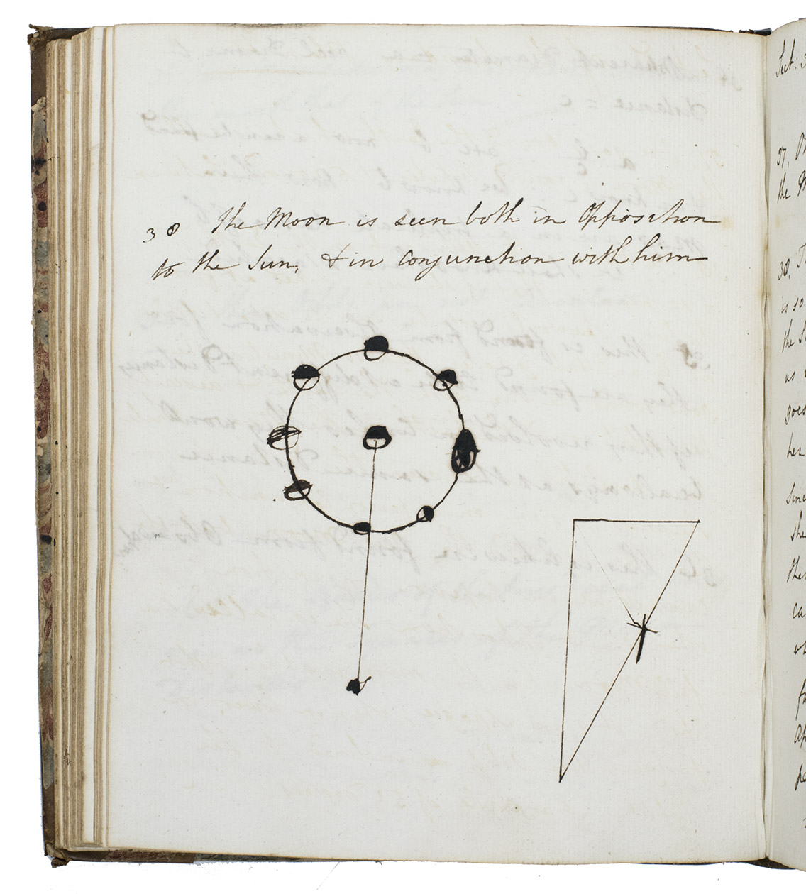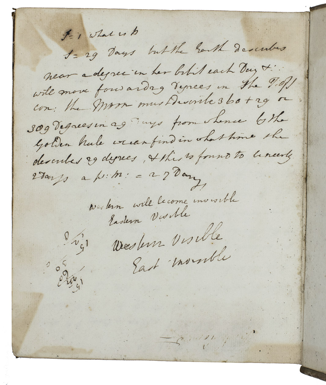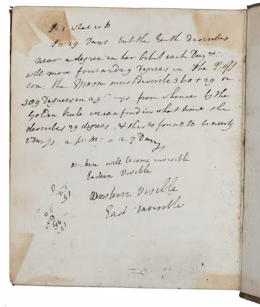 [England?, ca. 1777/1781?]. 4to. Manuscript volume of notes on practical astronomy and mathematics in English, written in ink on Dutch paper with a Maid of Dordrecht watermark without countermark. The leaves are numbered from the front, 101 and 26 leaves of text and diagrams, 39 blank leaves in the middle, last 26 leaves in reverse order, illustrated with several astronomical and mathematical diagrams, including one of a solar system. Late 18th-century half calf, marbled sides. 101, 26, [39 blank], 26 ll.