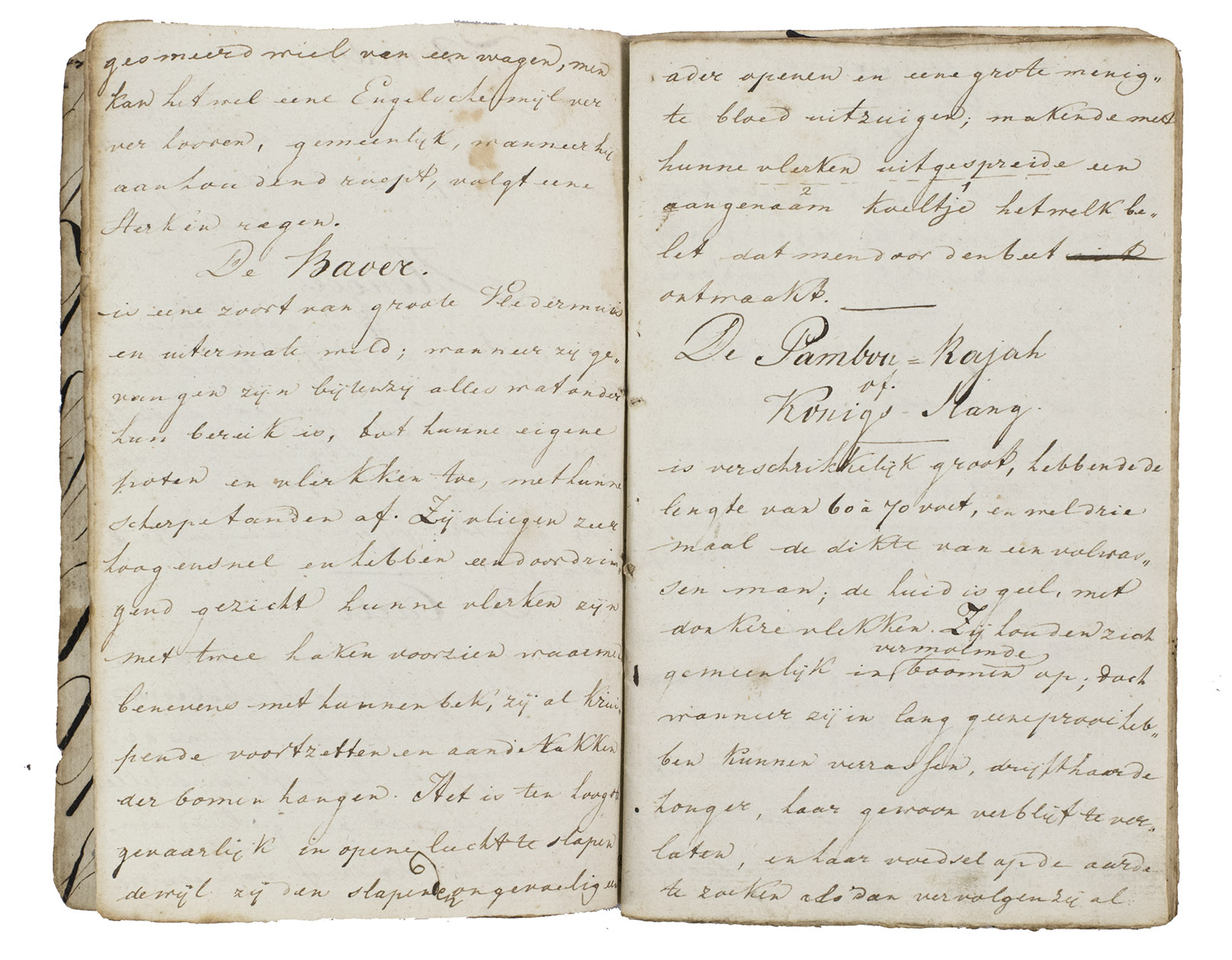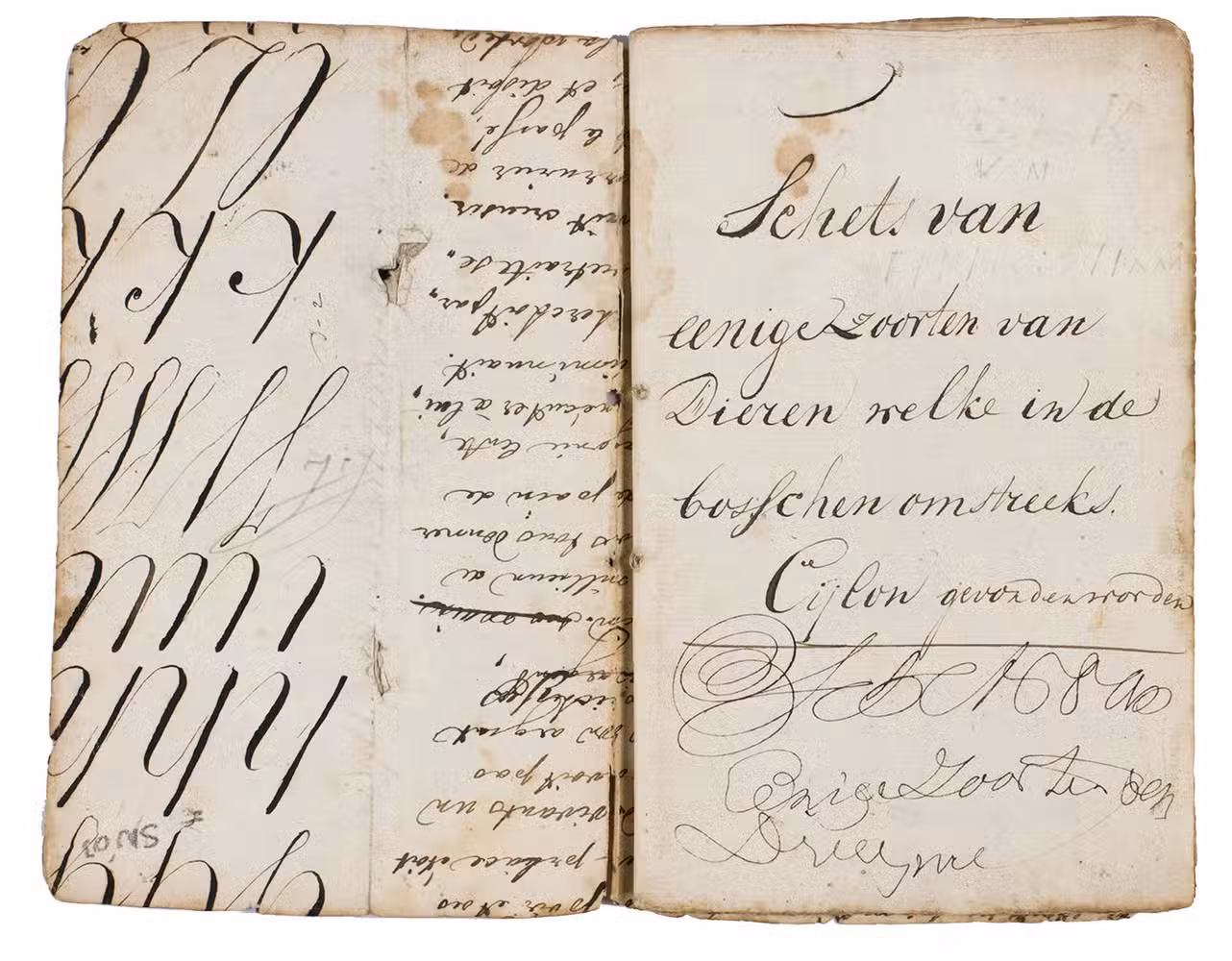 Ad 1: An interesting manuscript probably written by a Dutch person in the service of the VOC (Dutch East-India Company) during the time the VOC had trading stations and later was ruling Sri Lanka until 1802. Remarkably, the majority of the birds, snakes and other animals described here, are described by the same indigenous names as those used by Jacob Haafner in his Reize te voet door het eiland Ceilon (1754). The birds, other animals, plants and trees described include: a "kiroudin" (a kind of eagle or harrier native to the Malabar coast), the "pambou-rajah of konigs slang" (poisonous "Royal" snake), a "rollewaijs" (a Rollewai, a kind of bat, typical for Ceylon), the "tijger-royal" (Royal tiger), the "anacondo" (an anaconda or water boas, a large snake), a "alamaram/wortelboom" (mangrove tree), the "ananas" (pineapple), the "casjou" (cashew nut), and "mangas" (mangos), among many others.