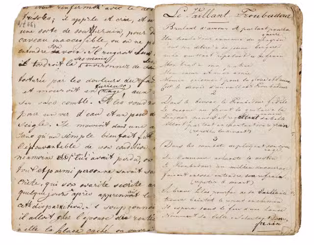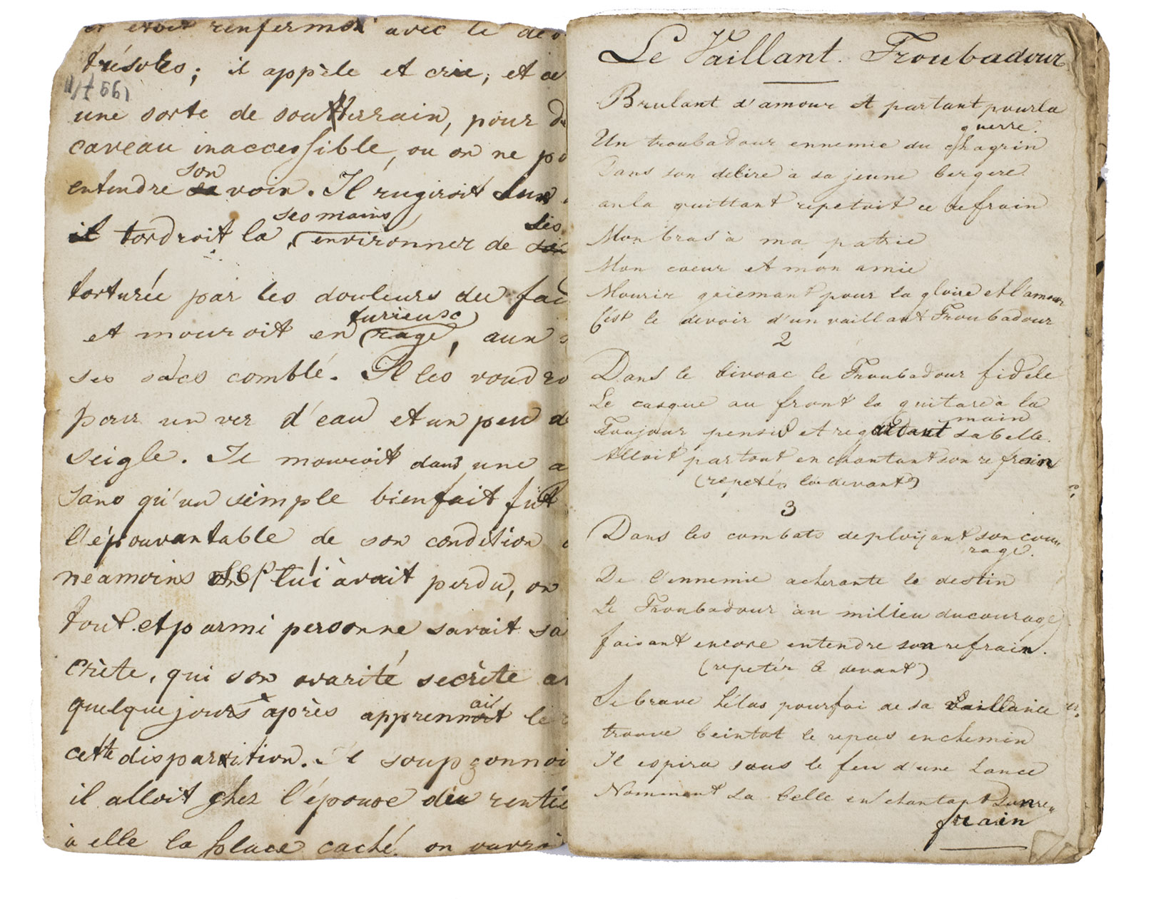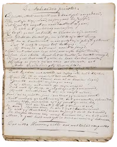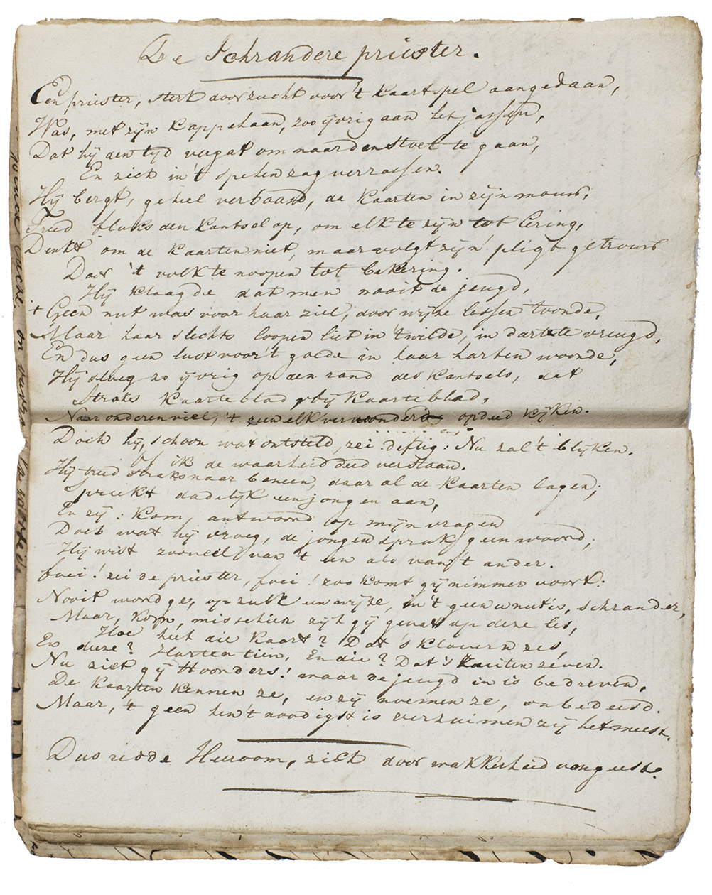 Ad 2: A manuscript written in French and Dutch, consisting of thirteen humorous poems and songs in French and Dutch. This part was probably added a few decades after the text on the natural history of Ceylon by the same author, possibly after their return to the Netherlands(?). It is written in a later hand (upside down and back to front from p. [28] to p. [15]): 6 humorous poems in French: "Le vaillant troubadour", "Romance" in 3 stanzas, "Romance de la petite Condrille" in 3 stanzas, [no title] in 3 stanzas, [no title] in 5 stanzas, and 7 humorous poems in Dutch: "Toverfluit", "Oost-Indië boven", [a riddle], "De schrandere priester", "De getrouwe raad", "De gereede raadgever", and finally "De predikant en de dorpsschout".