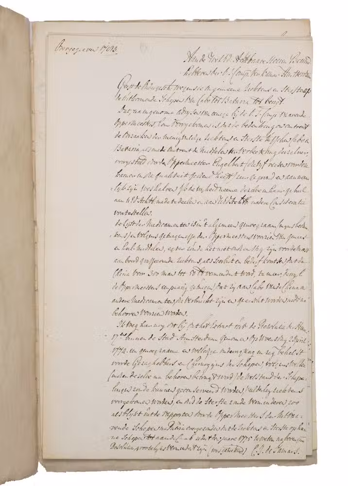 Particular emphasis is laid upon scurvy and putrid fevers, and upon the inadequacy of medical stores supplied at the Cape. De Jamars argues for a substantial increase in "China" (cinchona bark, the principal febrifuge of the period), recommending as much as 50 lb for a complement of 300 men. The document reflects the increasing institutional awareness within the VOC of shipboard hygiene, provisioning, and preventative medicine.