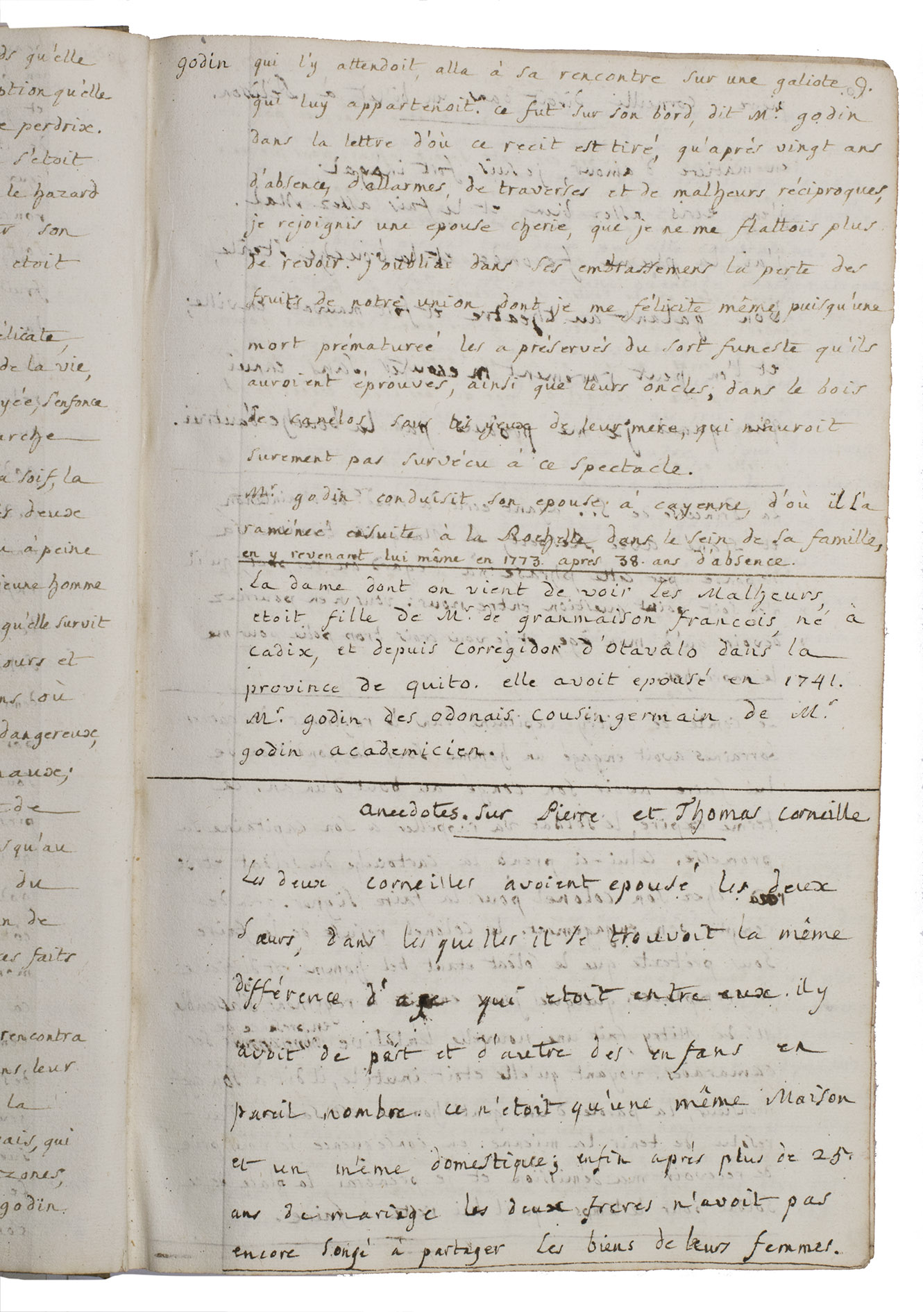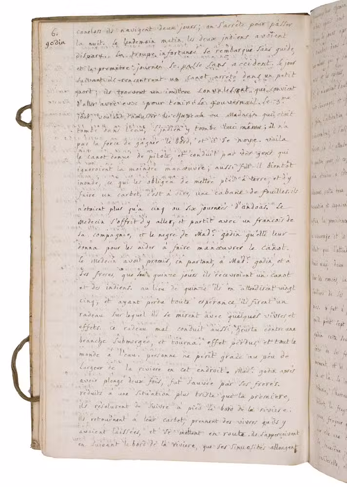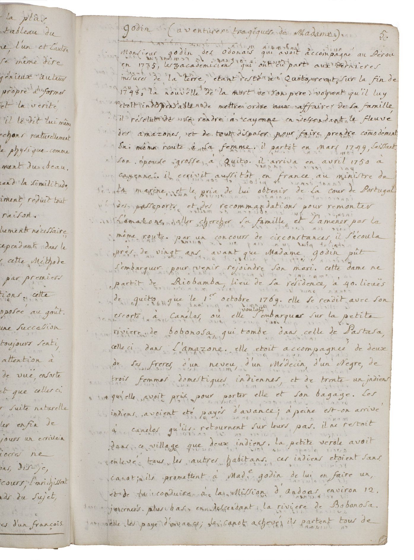 Pp. 5-9, are devoted to "Godin (aventures tragiques de Madame)", referring to Jean Godin des Odonais (1713-1792) and, more poignantly, to his wife Isabel Godin (1728-1792). After participating in the French geodesic mission to South America led by La Condamine, Jean Godin remained abroad for decades. Isabel, separated from her husband for 20 years, attempted a catastrophic descent of the Amazon in order to re-join him. Of the party that set out, most perished, she survived alone in the forest for several days before being rescued and ultimately reaching Cayenne.
