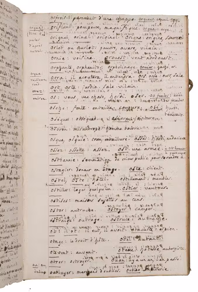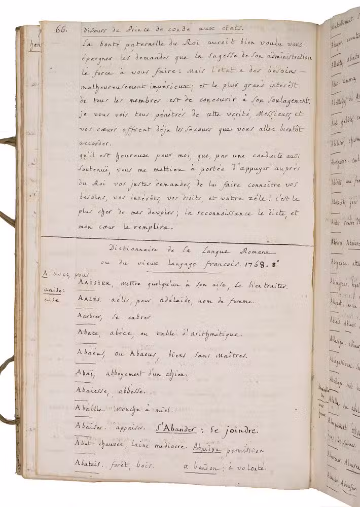 The largest portion of the manuscript (pp. 66-262) consists of a substantial transcript of the Dictionnaire de la langue romane ou du vieux langage françois (1768, 8vo), demonstrating sustained philological interest.