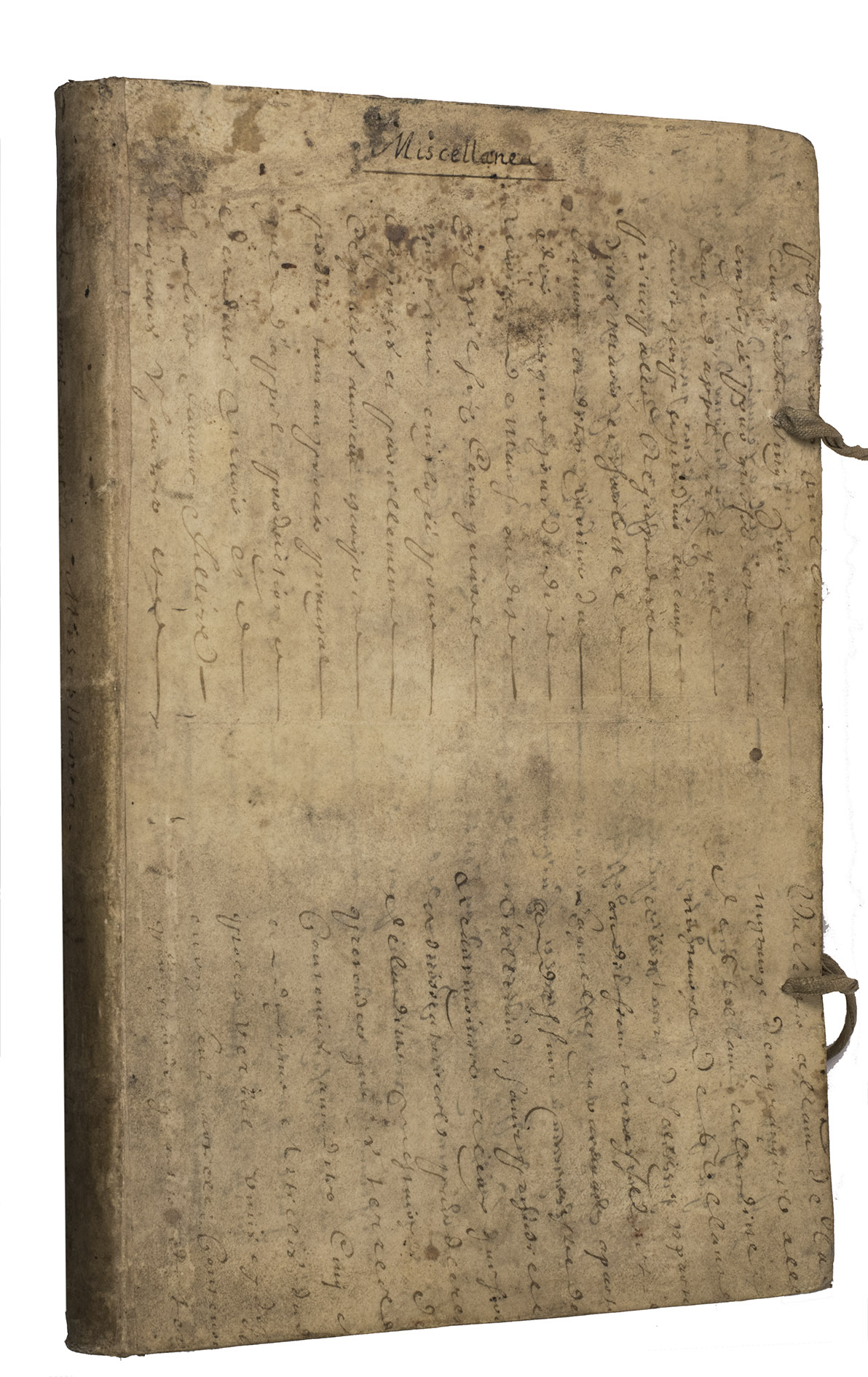 [France?, second half of the 18th century]. Folio (ca. 36.5 x 23 cm). French manuscript on paper, written in a neat 18th-century hand in brown and black ink, 26-28 lines to the page. Repurposed vellum from a 17th-century manuscript, with the manuscript title "Miscellanea" on the front board and the spine, and 2 pairs of cloth ties. 267, [2], [1 blank] pp.