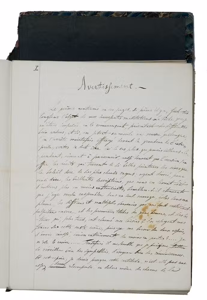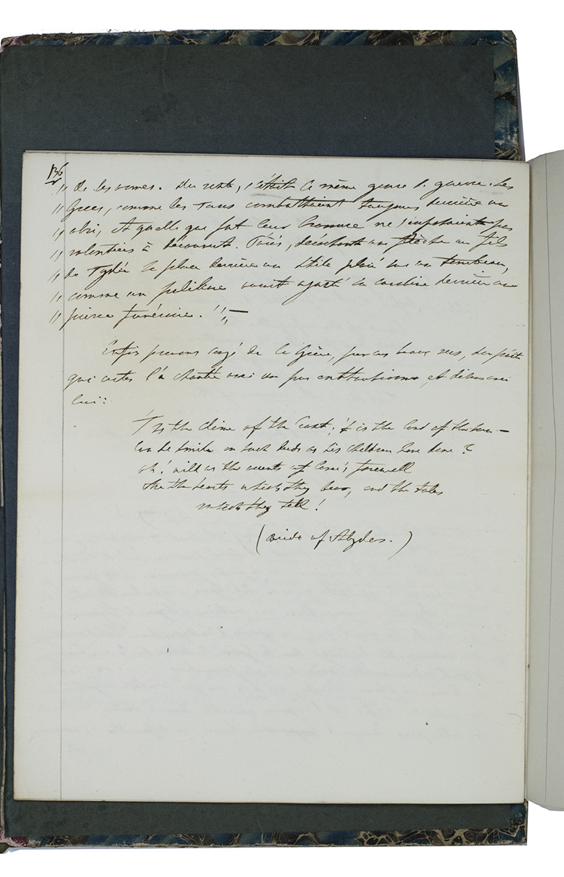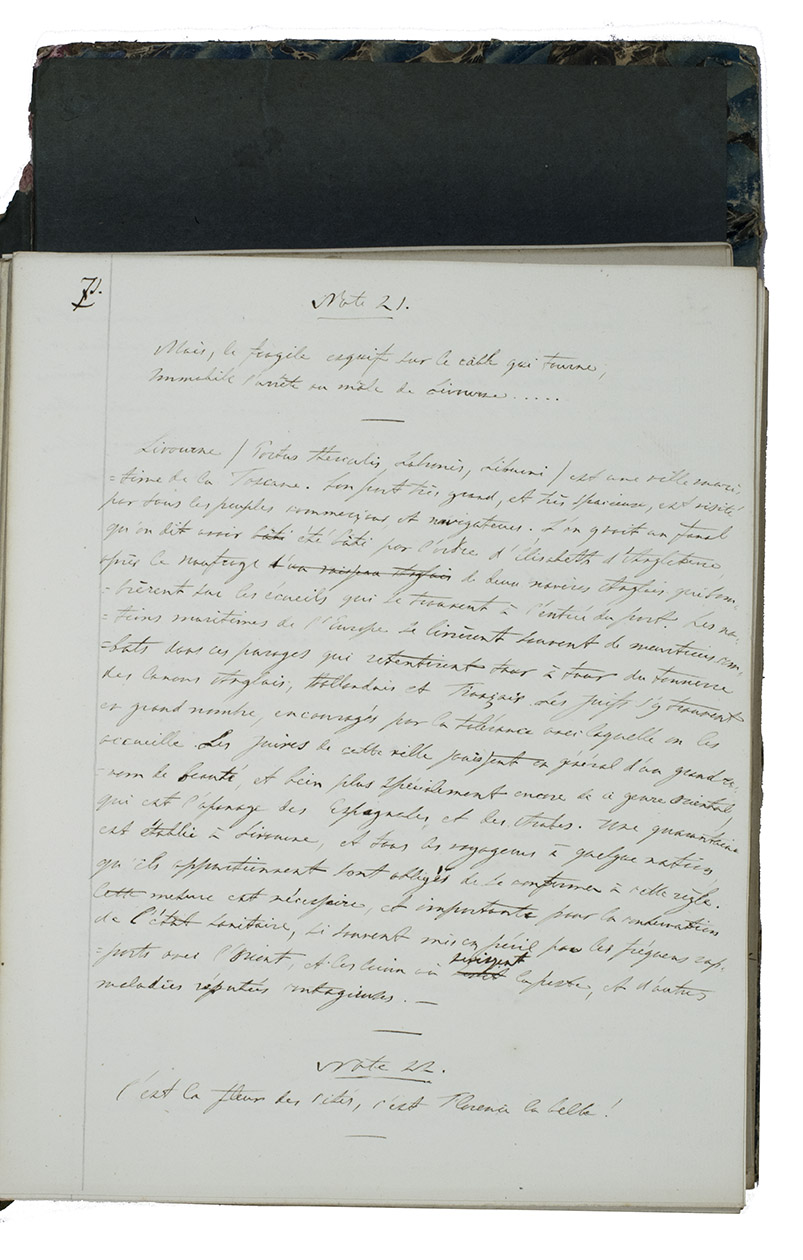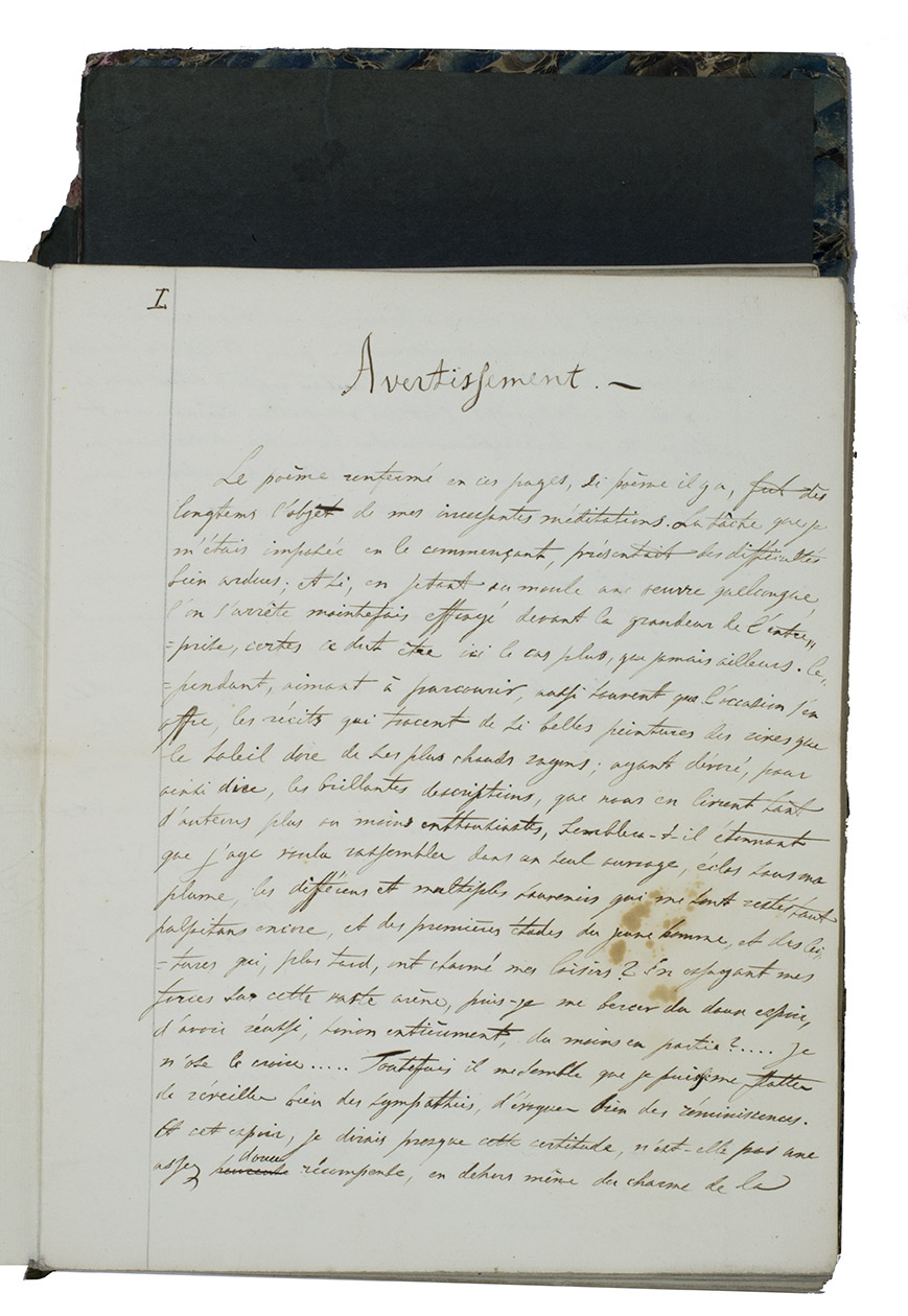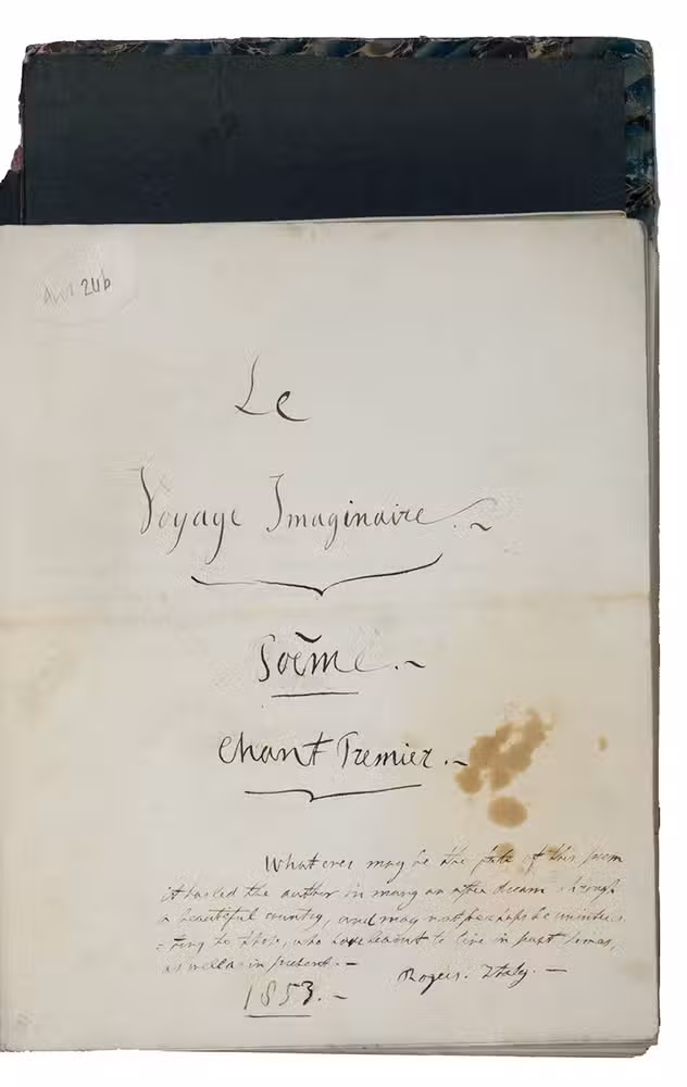 Extensive autograph poetical work in four "Chants", provided with elaborate notes, containing a romantic imaginary voyage in French verses. The anonymous author - indicating himself with his initials "J.F. v. H. (St.?)" - has composed the poem at the manor house "Adegeest" at Voorschoten, between The Hague and Leiden, and has dated his work: "Mars (deleted), and 1 April 1853. At the time the manor house was in the possession of the very rich family Dorrepad. G.L. Dorrepad (1816-1883) was an entrepreneur who had gathered his wealth in the Dutch East Indies (he was involved f.e. in a notorious financial scandal denounced by the famous Sicco Roorda van Eysinga). To all probability our anonymous author was the private teacher for his children at Adegeest.