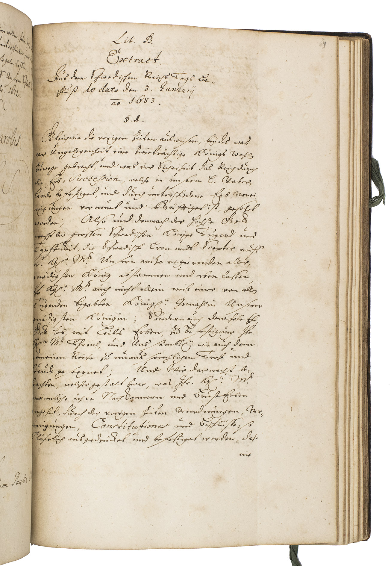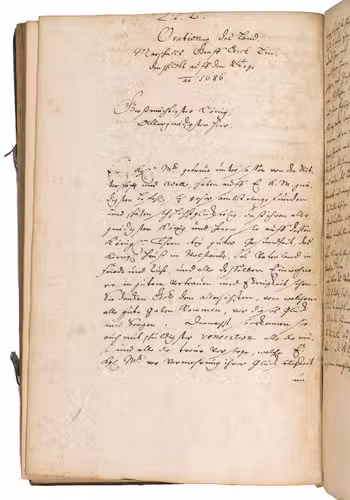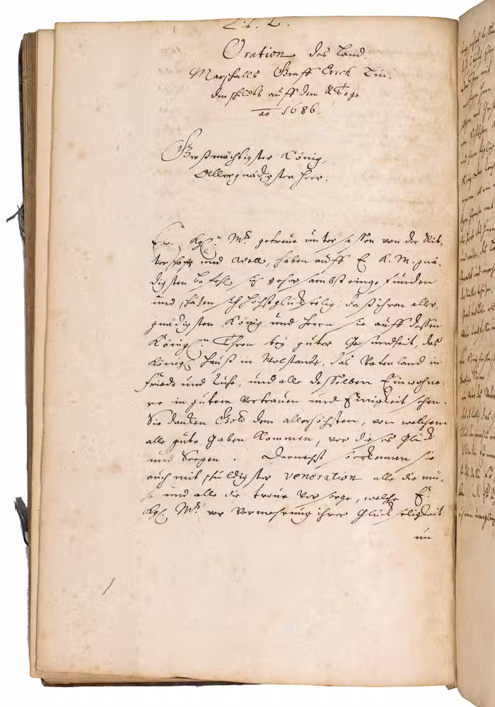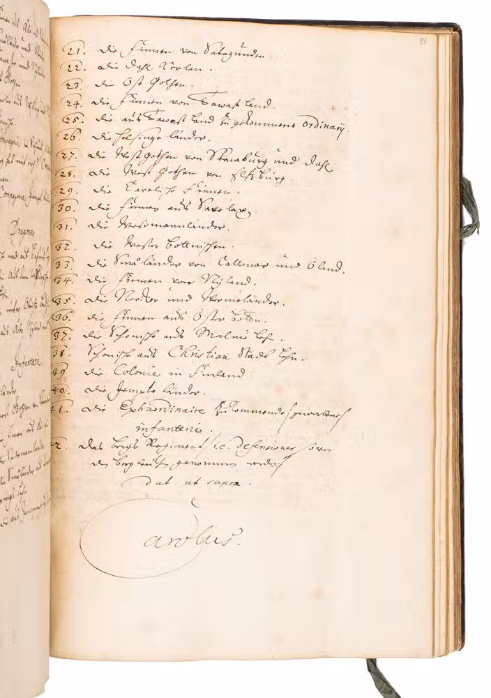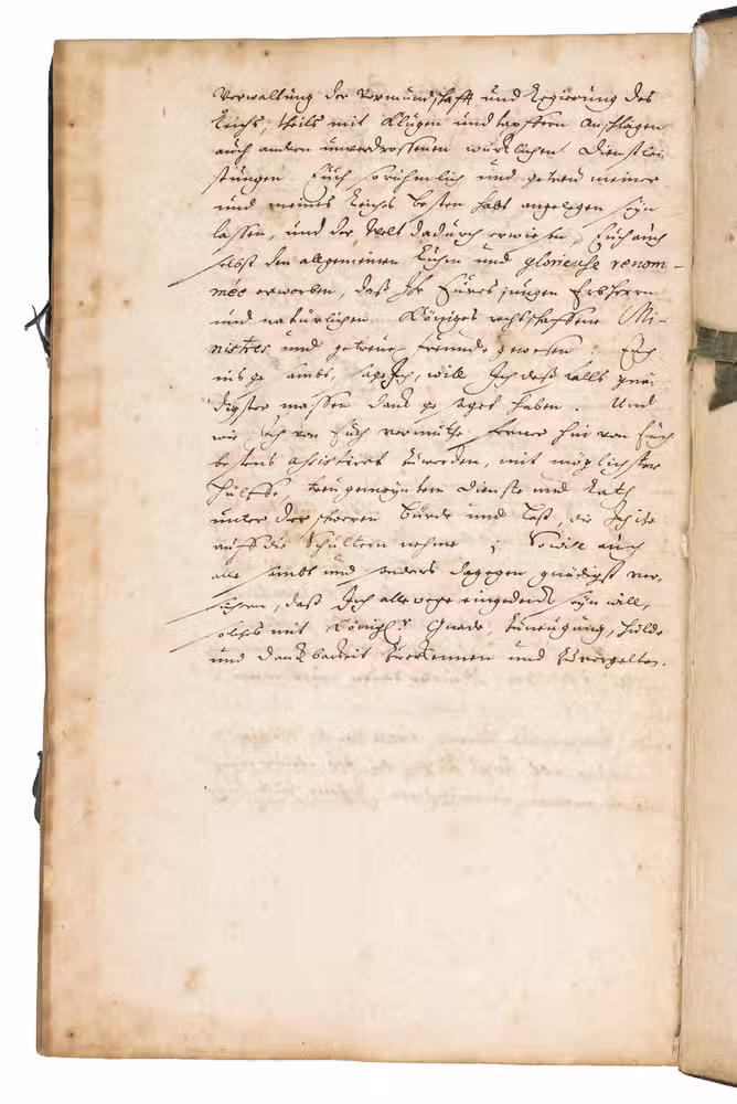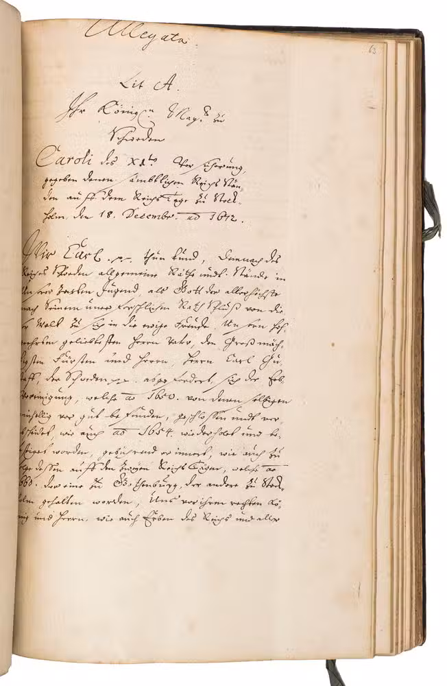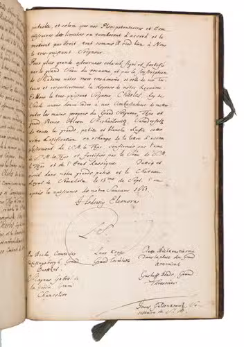 Remarkable manuscript on the history of Sweden in the 17th century, including the conclusion of the Russo-Swedish War (1656-1658). The work consists of two parts. The first is written in German and contains general descriptions of Sweden, excerpts on its governing structure, military system, the strength of the army, resolutions of the Swedish Rikstagen, and proclamations of King Charles XI (1660-1697) from the period 1672-1685. The second part, which starts on the recto of folio 109, is written in French, and contains a description and account of a Swedish embassy on their way to Russia in 1684, with descriptions of the members, the many gifts that were given to the Tsar and his daughter Princess Sophie, letters from the members of the embassy, and the text of the treaty.