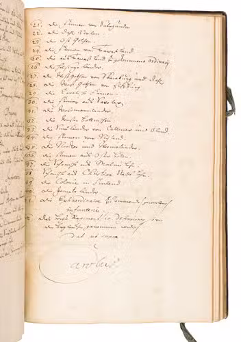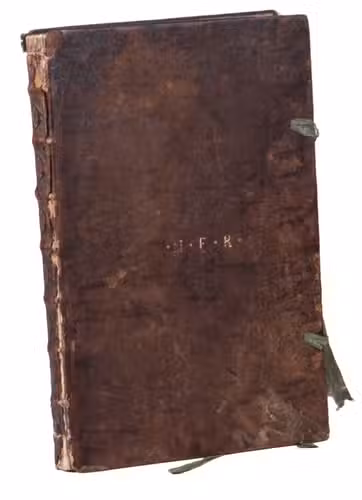 1684-1688. Folio (ca. 30 x 20 cm). The German part is neatly written in a Kurrent script, and the French part in a cursive hand. Contemporary gold-tooled calf, sewn on 7 supports with the corresponding raised bands on the spine, the initials "M.F.K" in the centre of the front board, red and black sprinkled edges, green closing ties. 167 ll.