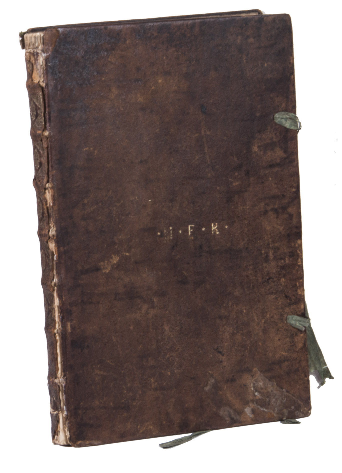 The boards are somewhat rubbed and scratched, missing a portion of leather at the bottom outer corner of the front board and at the head of the spine, the front hinge is broken, but the structural integrity of the binding is still partly intact, lacking a silk closing tie on the back, the other three are somewhat frayed. The work is somewhat browned and foxed throughout, the leaves have been folded in the past, and are numbered with pencil in a later hand. Otherwise in good condition.