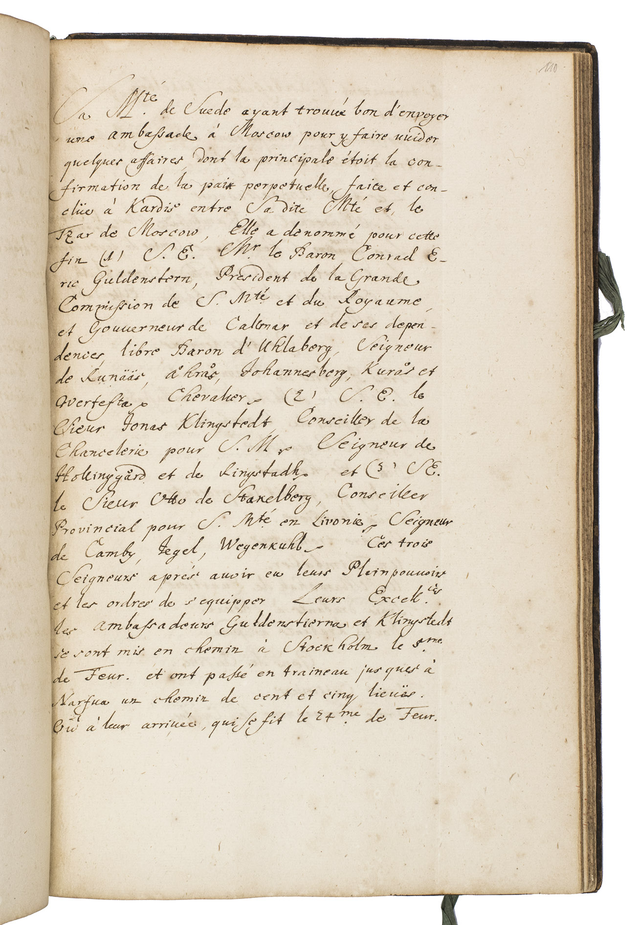 The Russo-Swedish War, or the War of Rupture, took place during the Northern War (1655-1660), which began when Sweden invaded Poland and claimed some of Russia's conquests in the region. After a two-year fight, Russia had to give in to Sweden's demands, and signed the Treaty of Cardis in 1661. A few decades later, Sweden sent an embassy to strengthen the relationship with Russia. It was led by Baron Conrad Erik Guldenstern, Baron dUhlaberg, Ahras Johannes Berg, Jonas Klingstedt, and Otto von Stakelberg, and is described in detail in the present manuscript. We have not been able to find any evidence that the manuscript was ever published.