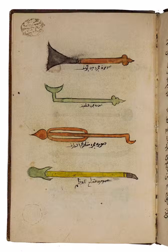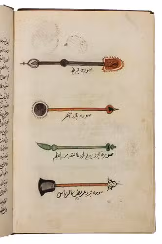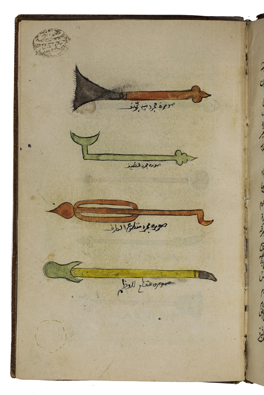 [colophon: 1279 AH (= 1862 CE)]. (ca. 17.5 x 10.5 cm). Manuscript on paper, written in a cursive, Persian-Arabic script in 15 to 23 lines per page. With 1 leaf containing 8 hand coloured illustrations, with captions, of medical instruments (4 instruments on respectively the recto and verso of leaf 26). Contemporary brown calf, with blind-stamped decorations. [29] ll.