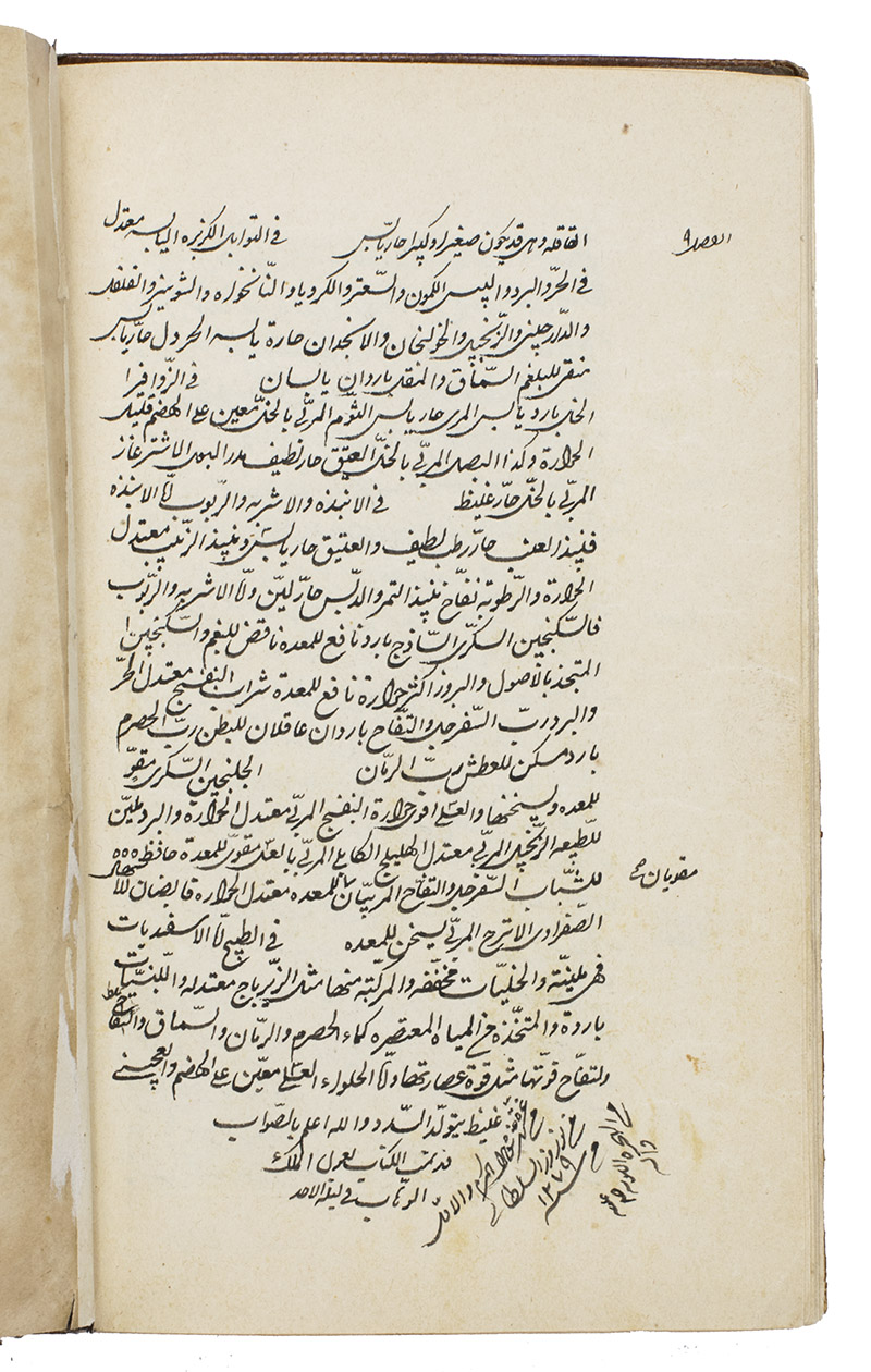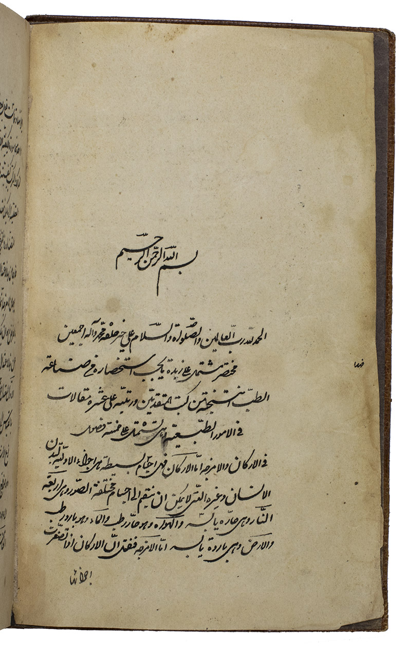 Arabic manuscript containing the Arabic translation of Ibn Sinas Qanunsah ("Small canon"), originally written in Persian: a brief medical compendium compiled by the Khwarazmian polymath Mahmud ibn Muhammad ibn Umar al-Gamini based on Ibn Sinas famous Qanun. This abridged manual of medicine is arranged in ten parts ("maqalat", or "discourses"), each containing several chapters. The first maqalat serves as a general introduction, dealing with the basic concepts of 14th century medical science and illustrating the various physical qualities (al-arkan) and body constitutions (al-amzigat), then focusing on the four Galenic humours (al-ahlat) - blood, phlegm, yellow and black bile - before discussing the parts of the body, the senses or faculties (al-quwá), and the preservation of ones natural temper (al-umur at-tabi iya). Further "discourses" treat anatomy, the various "conditions of the human body" ("ahwal badan al-insan"), the pulse, the "tafsira", or urine bottle given to the physician by the patient for inspection, the various aspects of the "wise management of diseases", "head diseases" and "diseases affecting the other body parts", chronic diseases of the various organs, evident defects (or "infirmities") in the external appearance of the body, fevers, and ultimately the importance of food and drink as remedies.