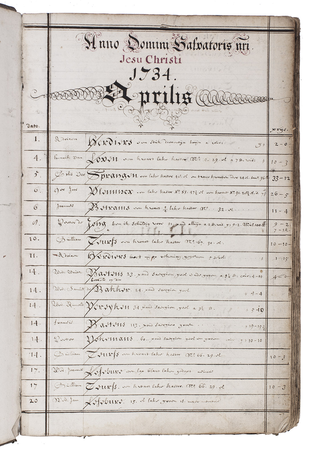 Daegelyksche aenteekening van alle de goederen te verwen komende bij Joannes Baptista Joffroy begonst 1734.