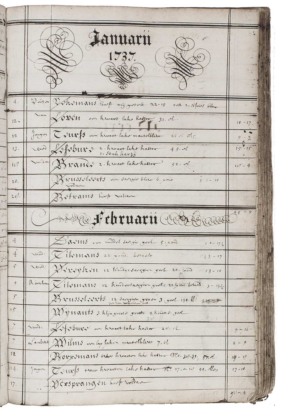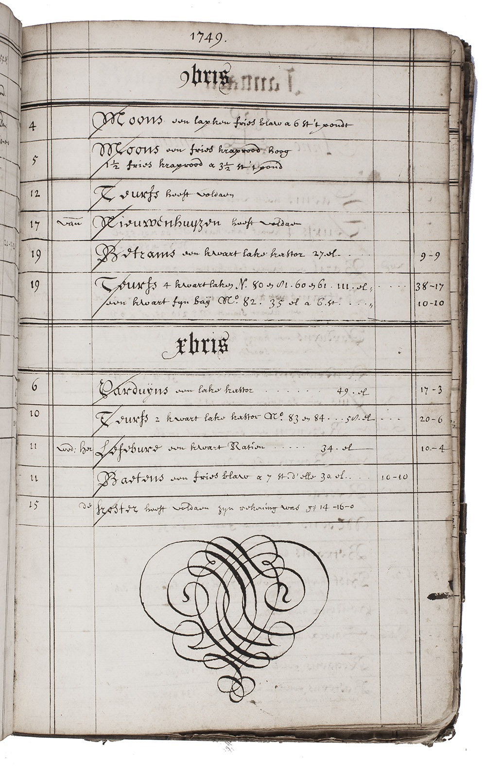 [Mechelen (Malines, Belgium), 1 April 1734-31 August 1759]. Folio (32.5 x 21 cm). Manuscript journal of accounts in dark brown ink on paper, written in Dutch in an upright gothic hand, with each page ruled in double and single lines to make 4 or 5 columns and up to 22 rows, decorated with hundreds of pen flourishes, three forming pictures of birds as tailpieces and with a decorative cross to begin 1750 (some other years with a simpler cross), a couple headings with additions in red. Contemporary vellum. [268] pp.