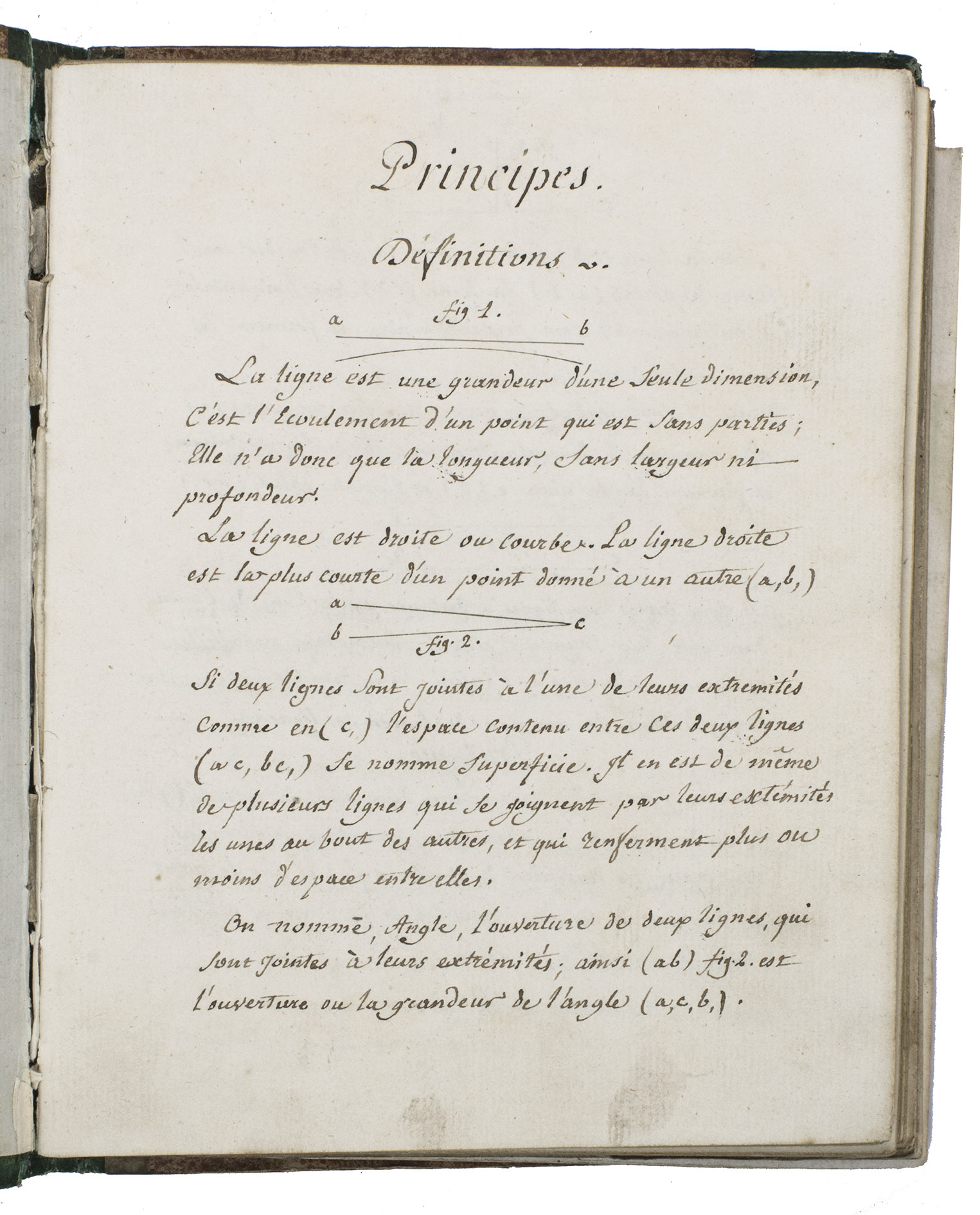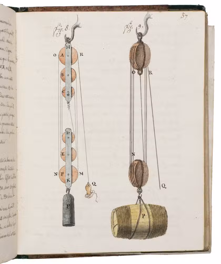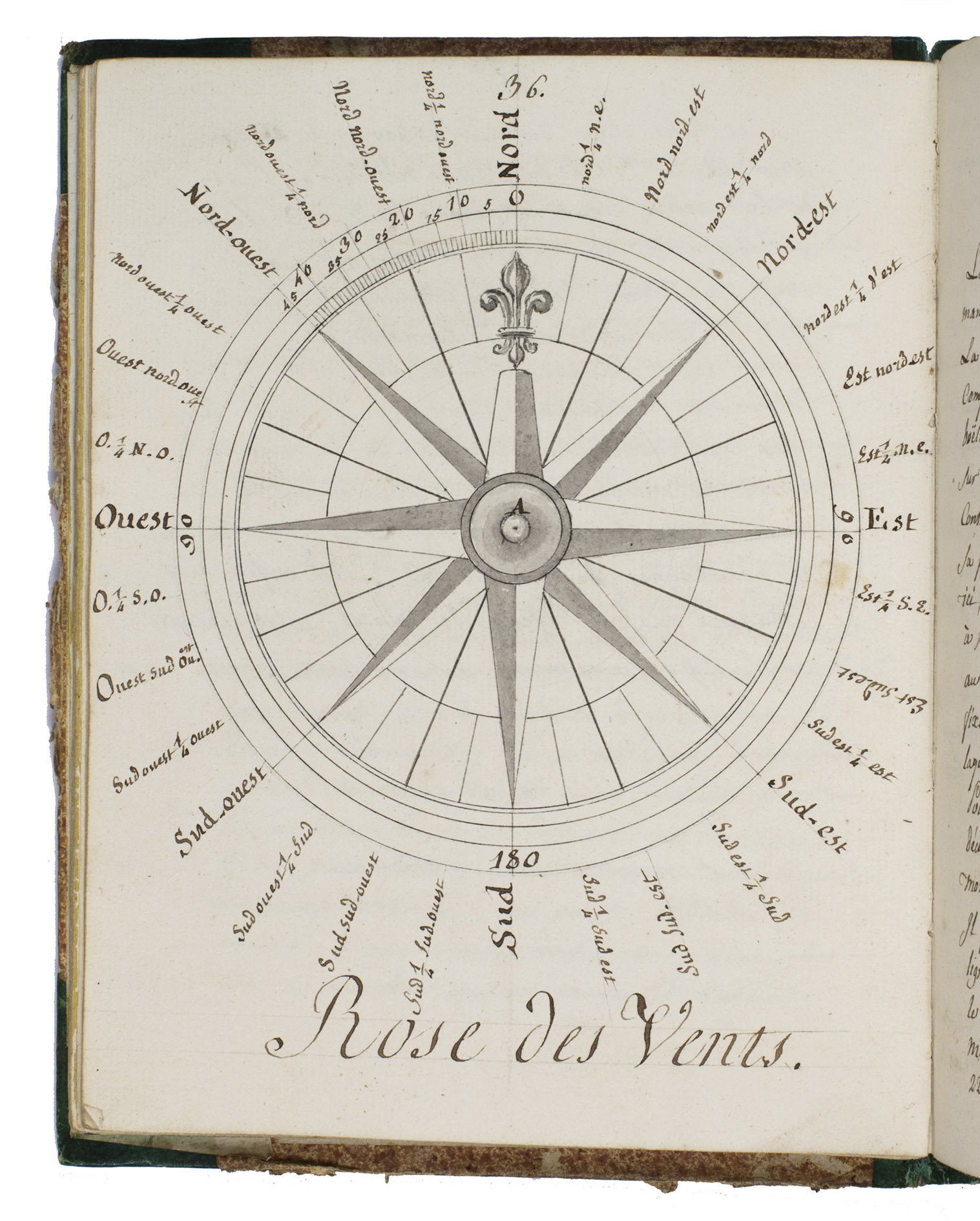 [France], January 1820. Small 4to (ca. 20.5 x 16 cm). With 6 hand-coloured folding illustrations, 3 full-page plates (on pp. 36, 57, and 83), 1 half-page plate (on p. 79), and numerous smaller mathematical figures, tables, and other illustrations in the text, most with grey washes and some in colour. The work is written in French in a very neat cursive hand. Contemporary half green painted sheepskin, red sprinkled paper sides. 151, [152-155 blank] pp.