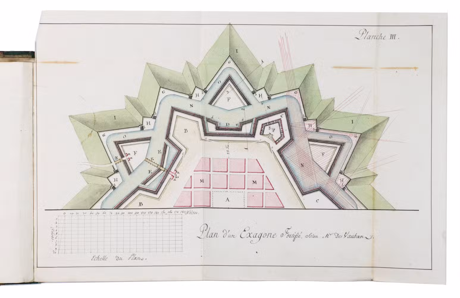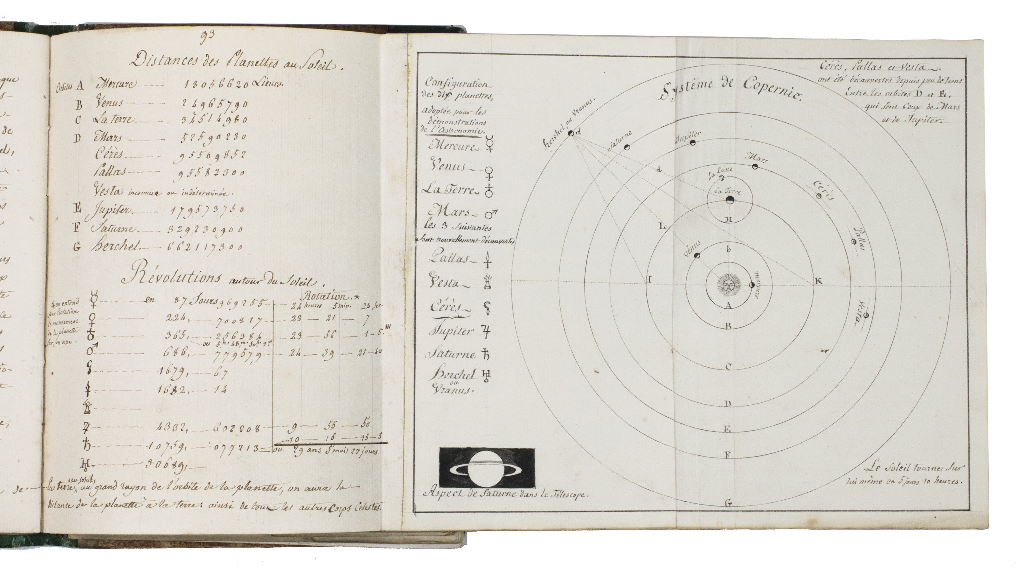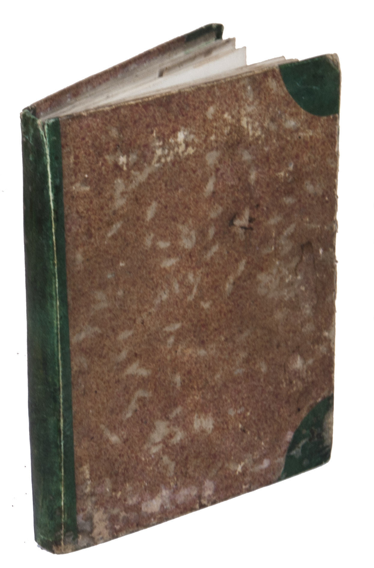 [France], January 1820. Small 4to (ca. 20.5 x 16 cm). With 6 hand-coloured folding illustrations, 3 full-page plates (on pp. 36, 57, and 83), 1 half-page plate (on p. 79), and numerous smaller mathematical figures, tables, and other illustrations in the text, most with grey washes and some in colour. The work is written in French in a very neat cursive hand. Contemporary half green painted sheepskin, red sprinkled paper sides. 151, [152-155 blank] pp.