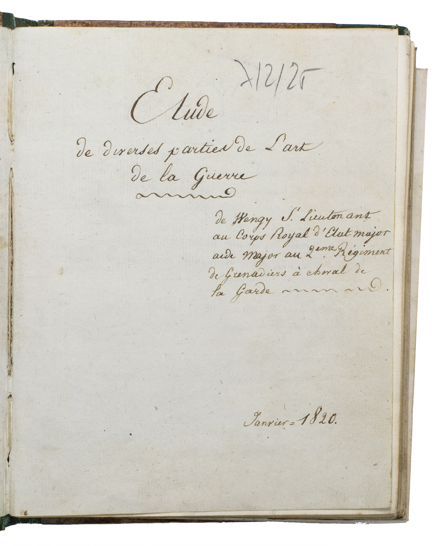 Striking early-19th-century manuscript study of a selection of important aspects of warfare, including fortifications, written by a French sub-lieutenant with the General Staff of the French army during the Second Bourbon Restauration under King Louis XVIII (1755-1824), serving in January 1802 as "aide major" to the second regiment of mounted grenadiers of the guard. The author of the present manuscript was most likely Alcibiade Morlot de Wengi. He was born in Dijon in 1799 and in 1834 he married Augustine Françoise Smith (1805-1858), with whom he had a son called Ulric Napoléon (1835-1890). Furthermore, it is known that he was a "Colonel d'état-major" in 1853 and he died in Saint-Germain-en-Laye in 1857.