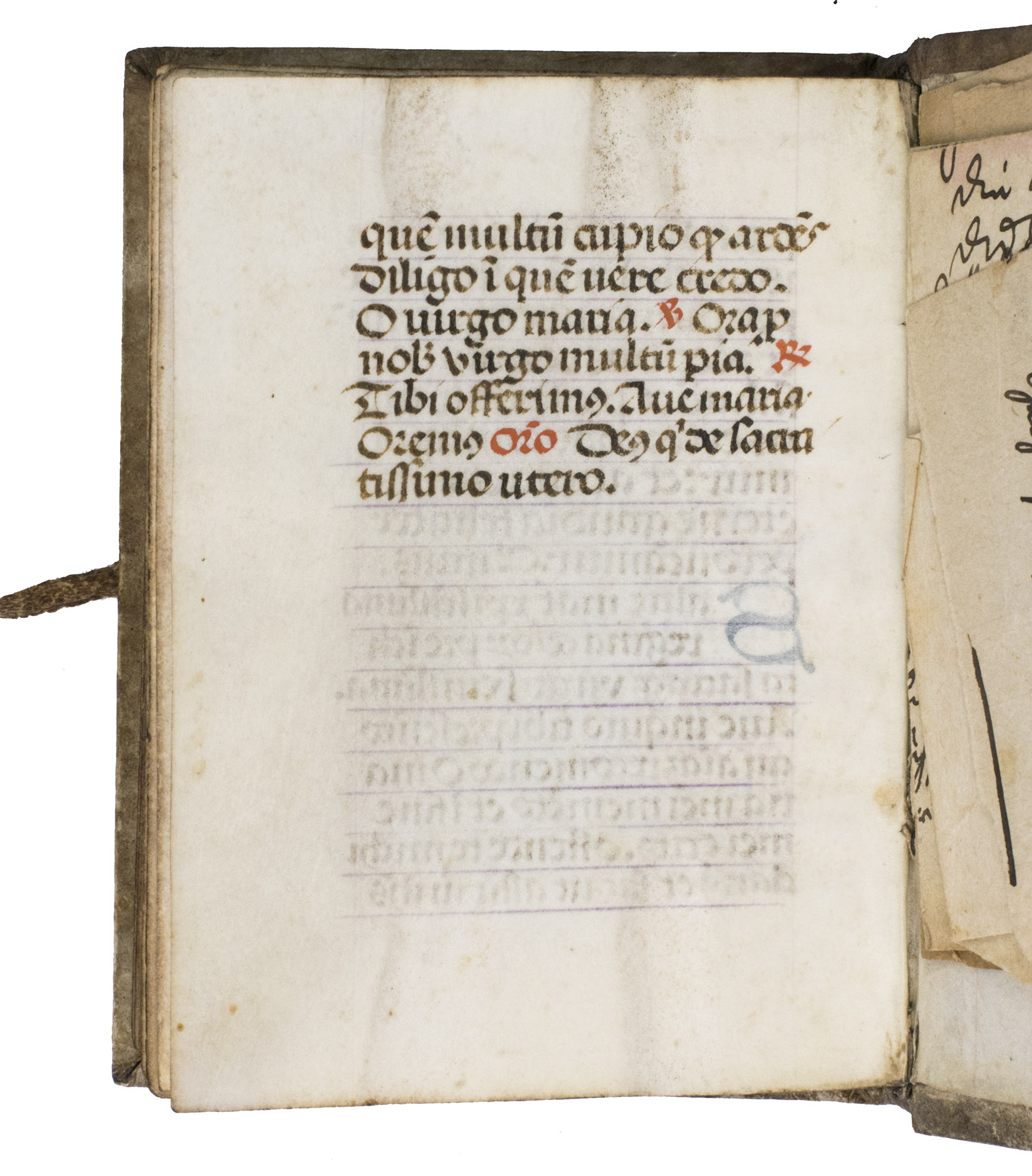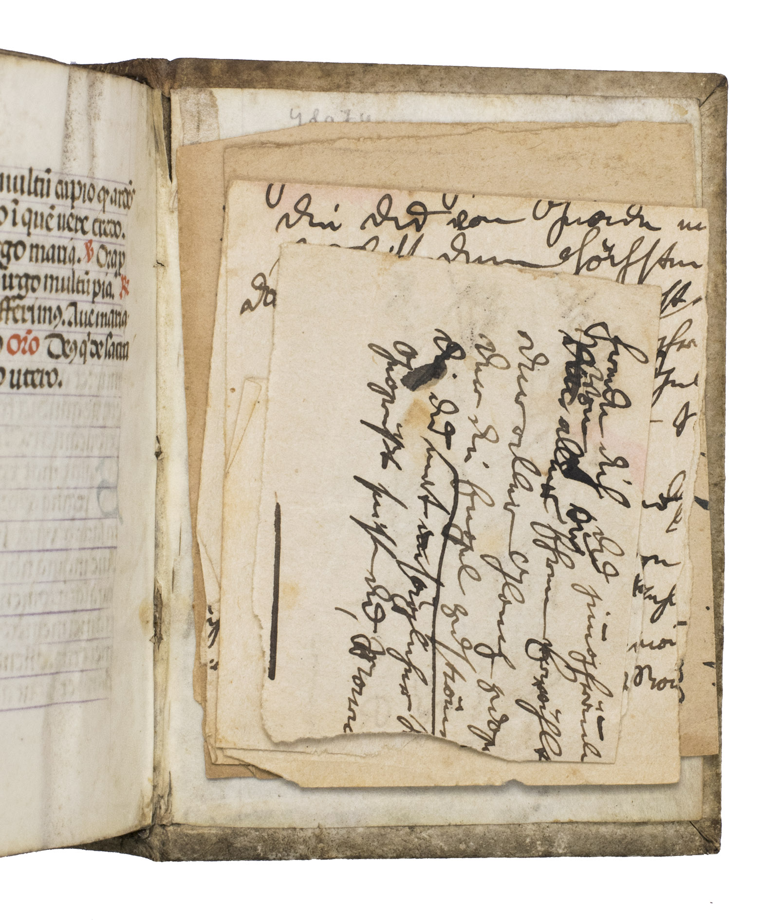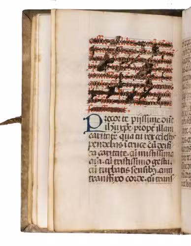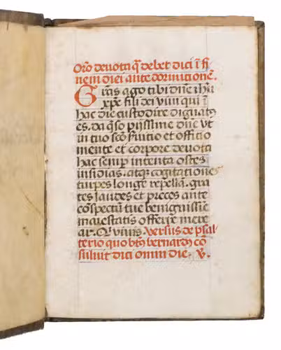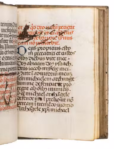 With a manuscript owners inscription on the front paste-down, some pencil annotations on the front paste-down, and some loose paper scraps showing manuscript prayers after leaf [131]v. The vellum on the binding is (artificially) darkened and the closing tie on the back board is missing. Quires a-e8, the first three leaves of quire f, and possibly a leaf in quire k are lacking, otherwise the text is complete according to the catchwords between the present quires. With a small hole on leaf [3], with partial loss of one letter, portions of text (primarily rubrication) have been crossed out on leaves [8, 15r, 26, 28r, 33v, 35v and 36r], the ink on some of the leaves is rubbed. Otherwise in very good condition.