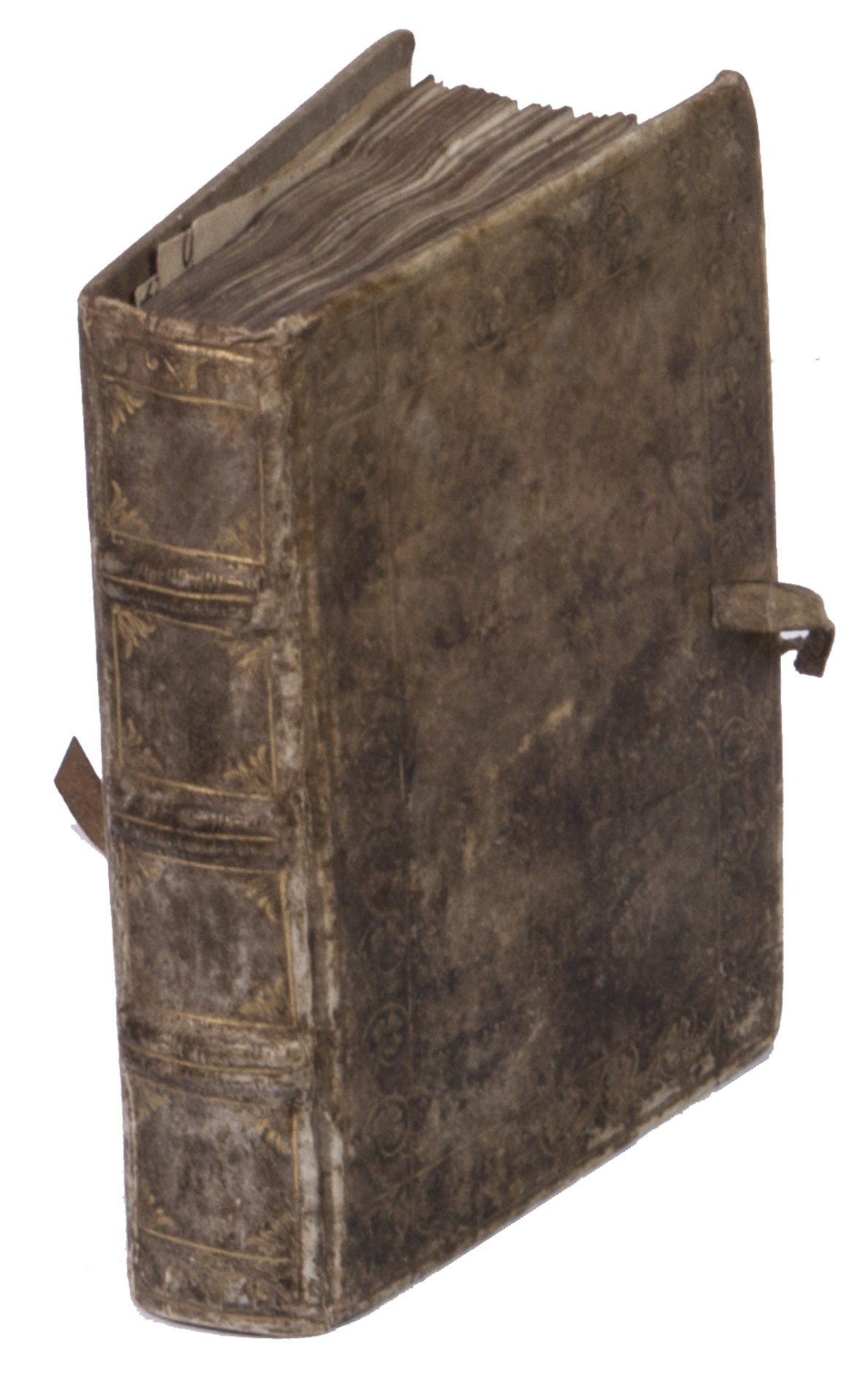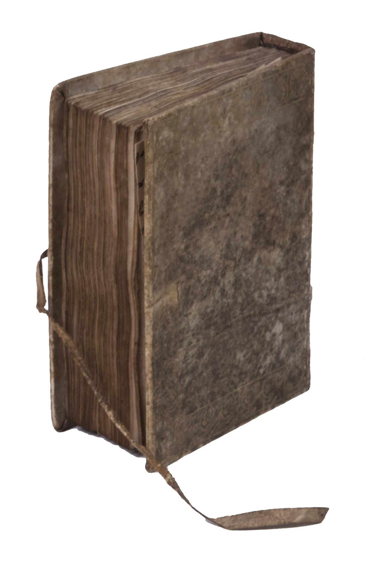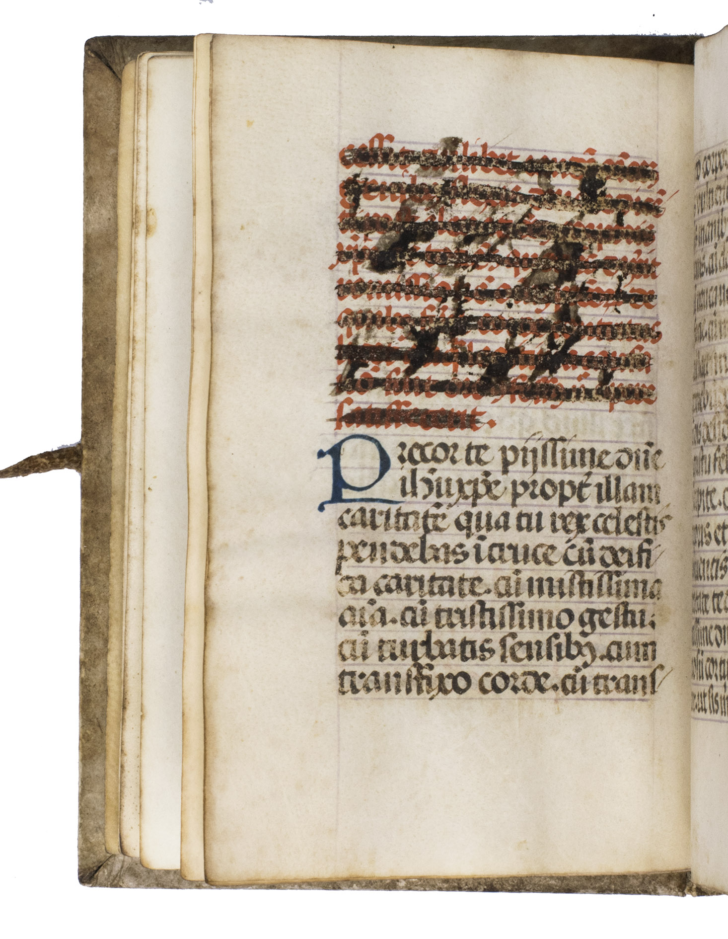 With a manuscript owners inscription on the front paste-down, some pencil annotations on the front paste-down, and some loose paper scraps showing manuscript prayers after leaf [131]v. The vellum on the binding is (artificially) darkened and the closing tie on the back board is missing. Quires a-e8, the first three leaves of quire f, and possibly a leaf in quire k are lacking, otherwise the text is complete according to the catchwords between the present quires. With a small hole on leaf [3], with partial loss of one letter, portions of text (primarily rubrication) have been crossed out on leaves [8, 15r, 26, 28r, 33v, 35v and 36r], the ink on some of the leaves is rubbed. Otherwise in very good condition.