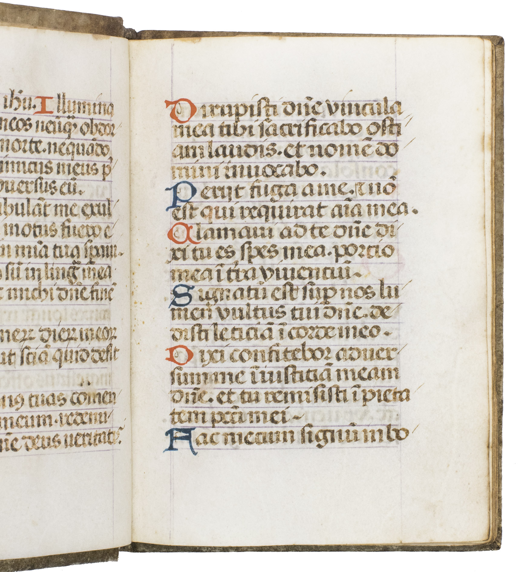 [Northern Germany(?), 15th century]. 8vo. Written in Latin on relatively thin parchment (leaf 11.5 x 8.5 cm, text block 7.8 x 5.2 cm), in a gothic hand in one column of 17 lines per page using black/dark brown ink. The manuscript is rubricated throughout, with a 3-line red and blue initial at the start of each part, and 2- or 1-line lombards, alternating in red and blue, at the start of each smaller section, ruled in pencil. Early 19th-century(?) gold-tooled vellum showing a gold-tooled floral frame on both boards, with a leather closing tie on the front, gold-tooled board eges, gilt edges. [131] ll.