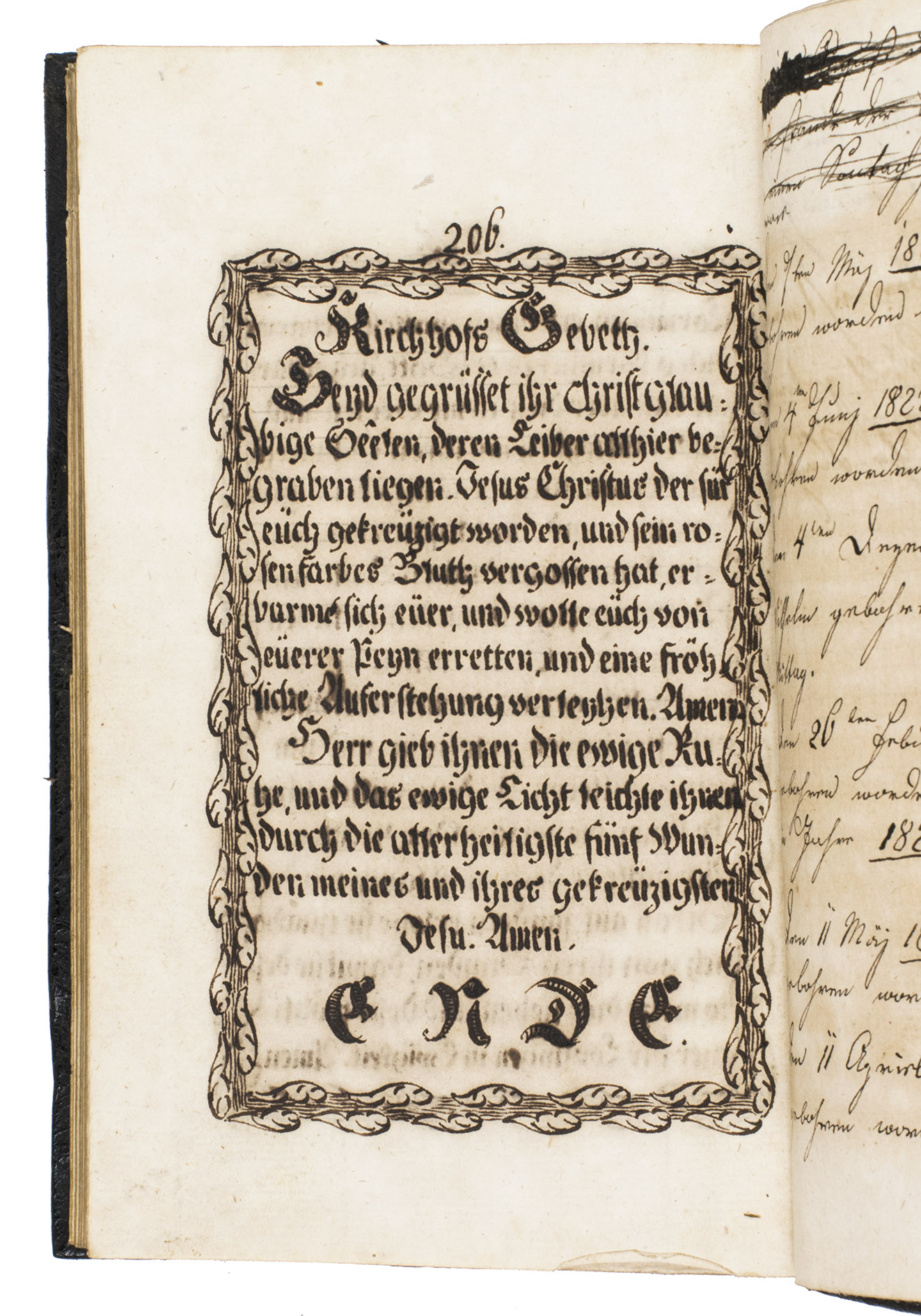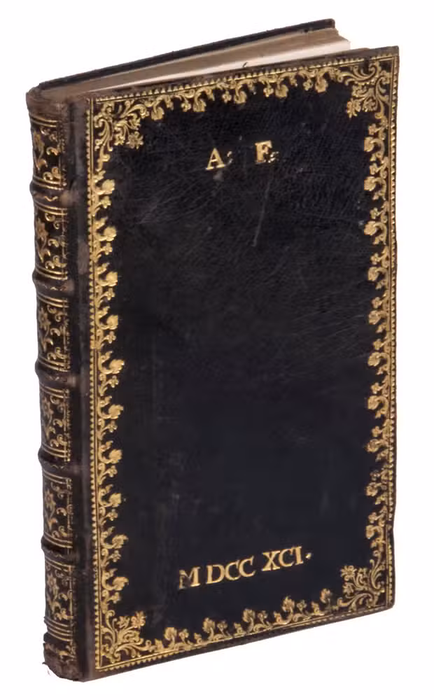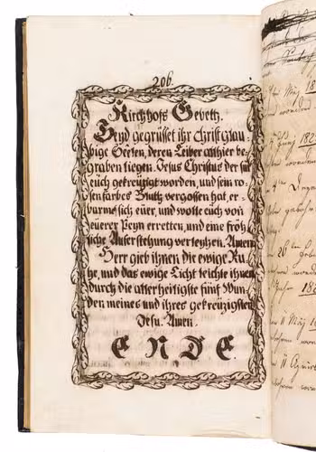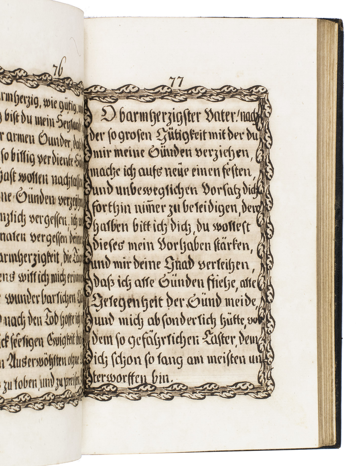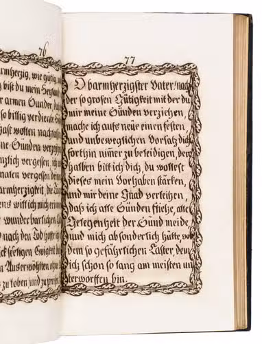 With numerous 19th-century manuscript annotations in German on the first and last few blank pages (dated 1821-1862) reminiscent of notes written in family bibles, including 1 crossed out at the head of the page facing p. 206. Included between the last few blank pages is a manuscript prayer in German, written in minute cursive script on a folding piece of paper. The edges of the boards are very slightly rubbed, the spine shows clear signs of wear and the foot of the spine is slightly damaged with minor loss of material. A few minor wormholes in the front pastedown and first few leaves, barely affecting the 19th-century annotations, internally somewhat foxed and the pages have browned due to some ink corrosion (not affecting the general legibility of the text, but affecting the inner margins of pp. 197-202). Otherwise the work is in good condition. The slipcase is worn, with loss of material on most sides and with the head of the case completely gone. The work itself is a magnificent example of a late-18th-century manuscript prayer book in German, in a beautiful contemporary gold-tooled binding.