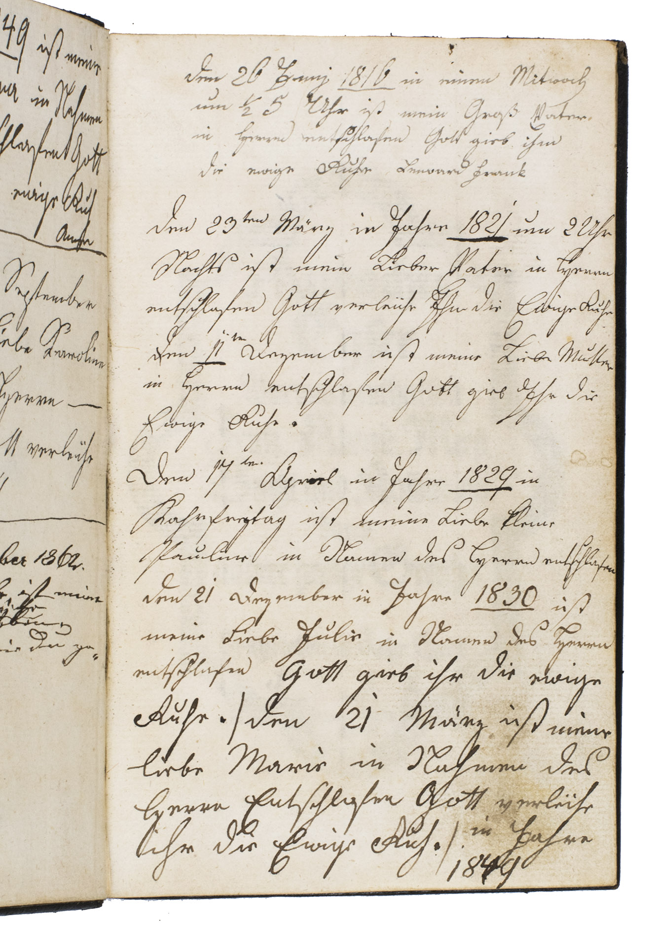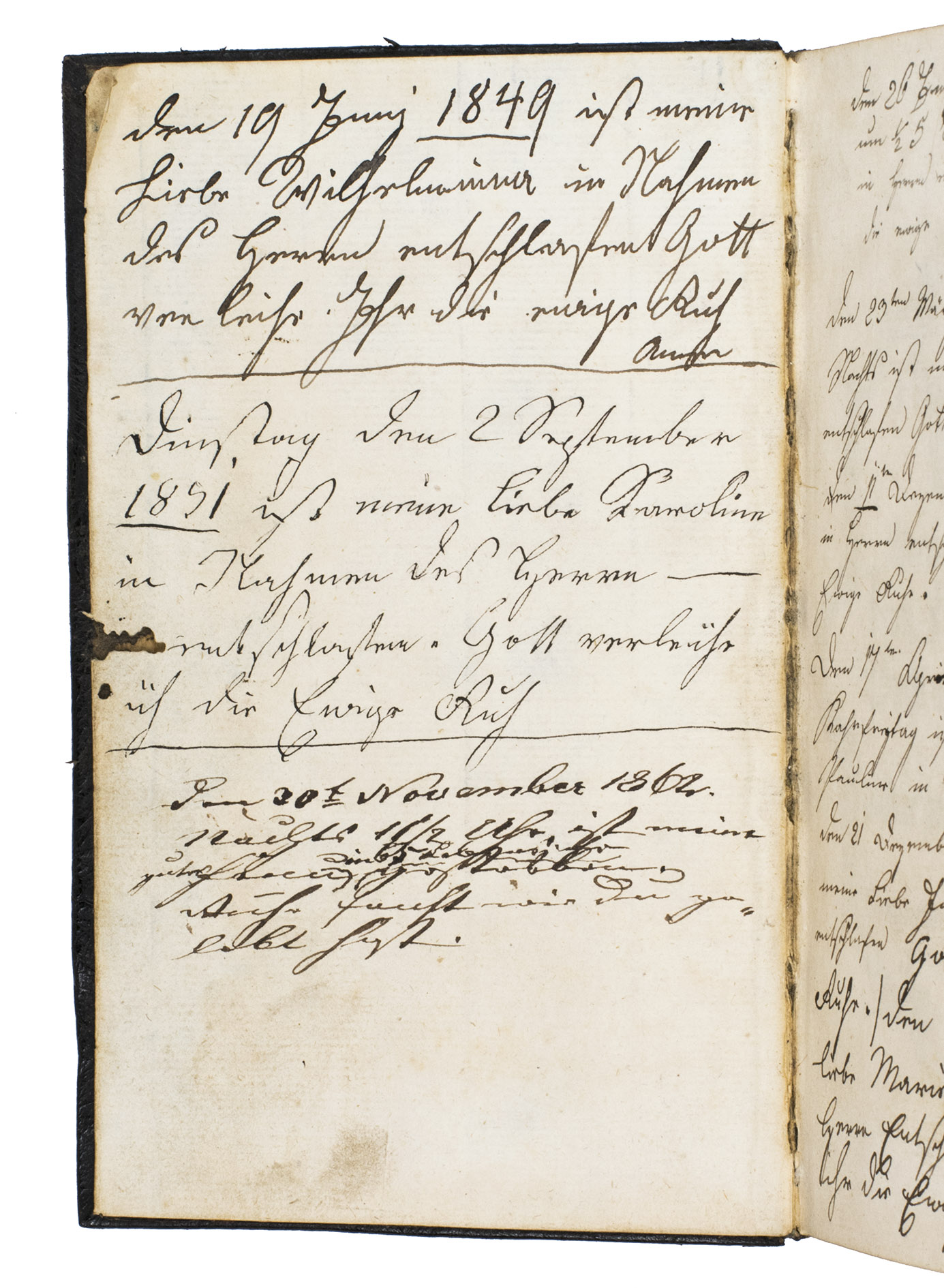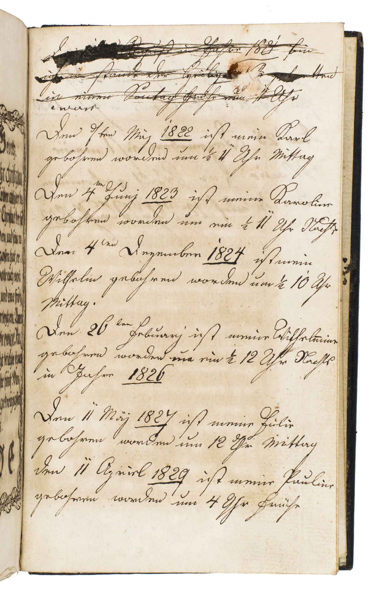 With numerous 19th-century manuscript annotations in German on the first and last few blank pages (dated 1821-1862) reminiscent of notes written in family bibles, including 1 crossed out at the head of the page facing p. 206. Included between the last few blank pages is a manuscript prayer in German, written in minute cursive script on a folding piece of paper. The edges of the boards are very slightly rubbed, the spine shows clear signs of wear and the foot of the spine is slightly damaged with minor loss of material. A few minor wormholes in the front pastedown and first few leaves, barely affecting the 19th-century annotations, internally somewhat foxed and the pages have browned due to some ink corrosion (not affecting the general legibility of the text, but affecting the inner margins of pp. 197-202). Otherwise the work is in good condition. The slipcase is worn, with loss of material on most sides and with the head of the case completely gone. The work itself is a magnificent example of a late-18th-century manuscript prayer book in German, in a beautiful contemporary gold-tooled binding.
