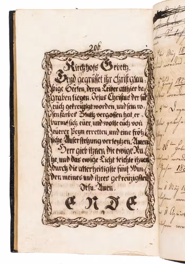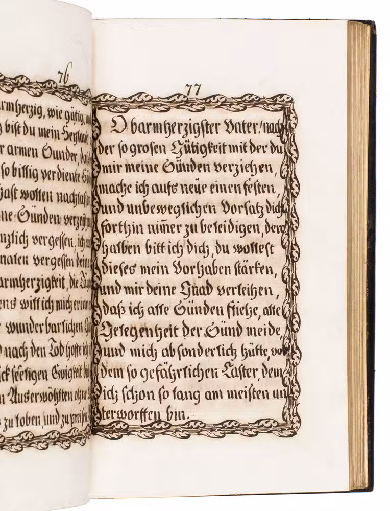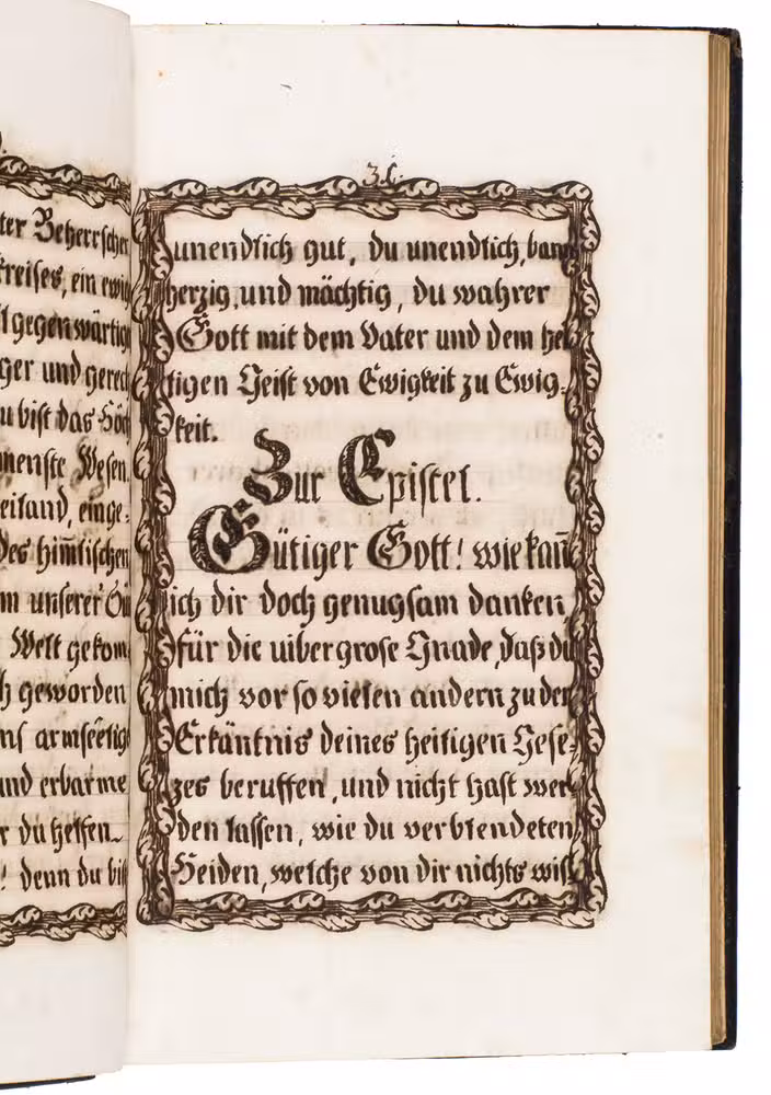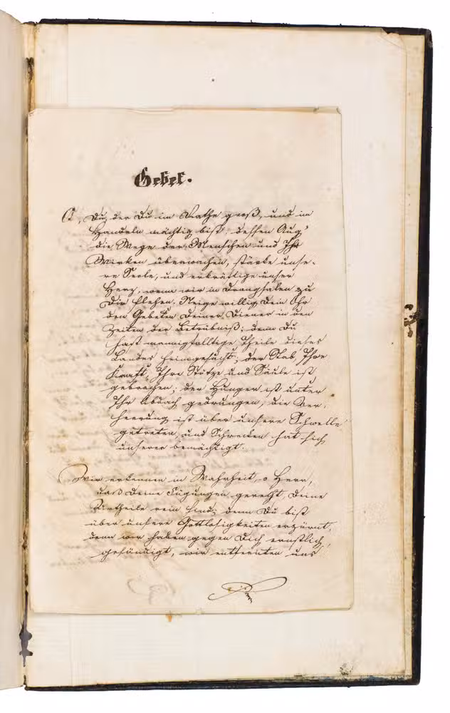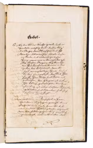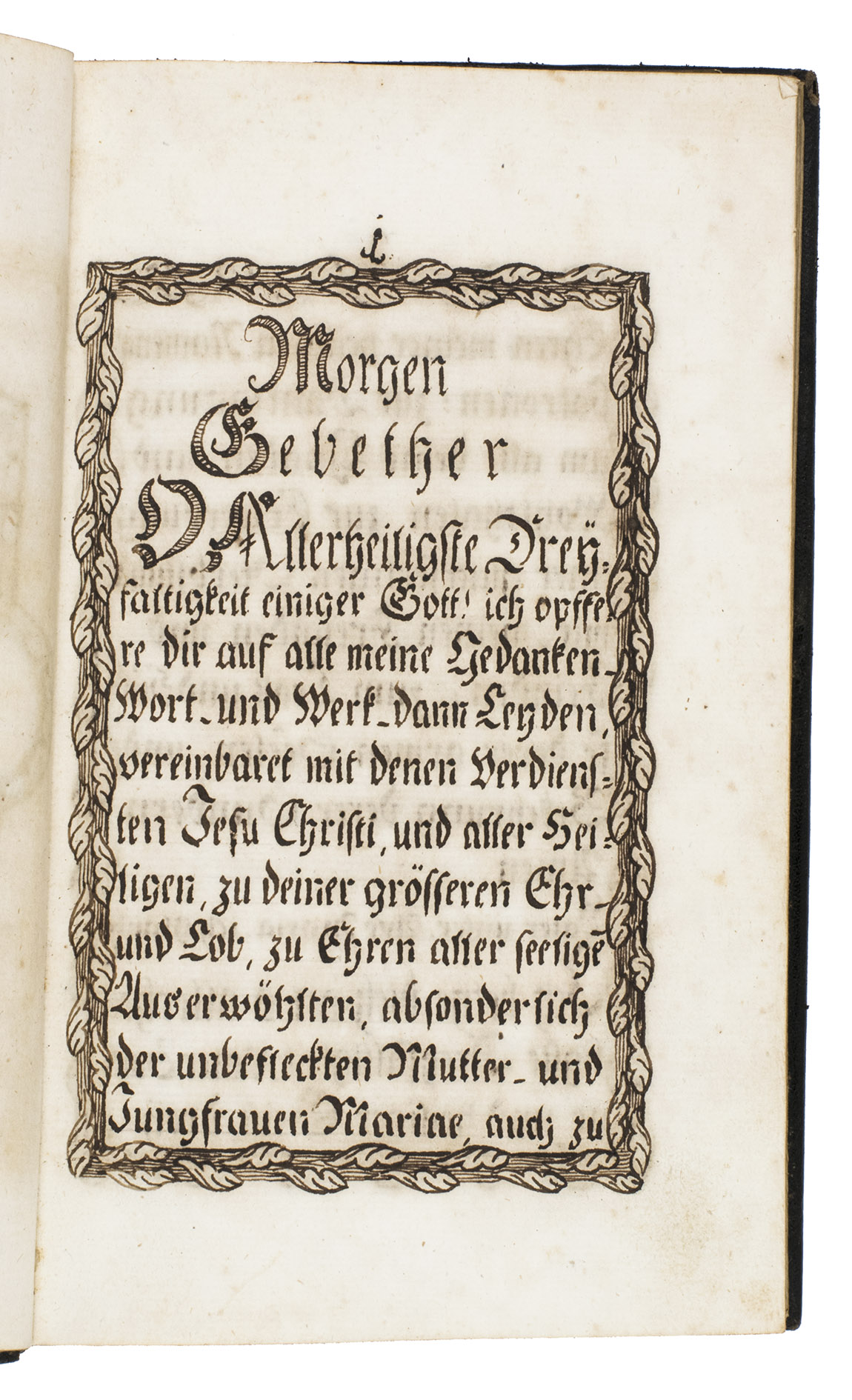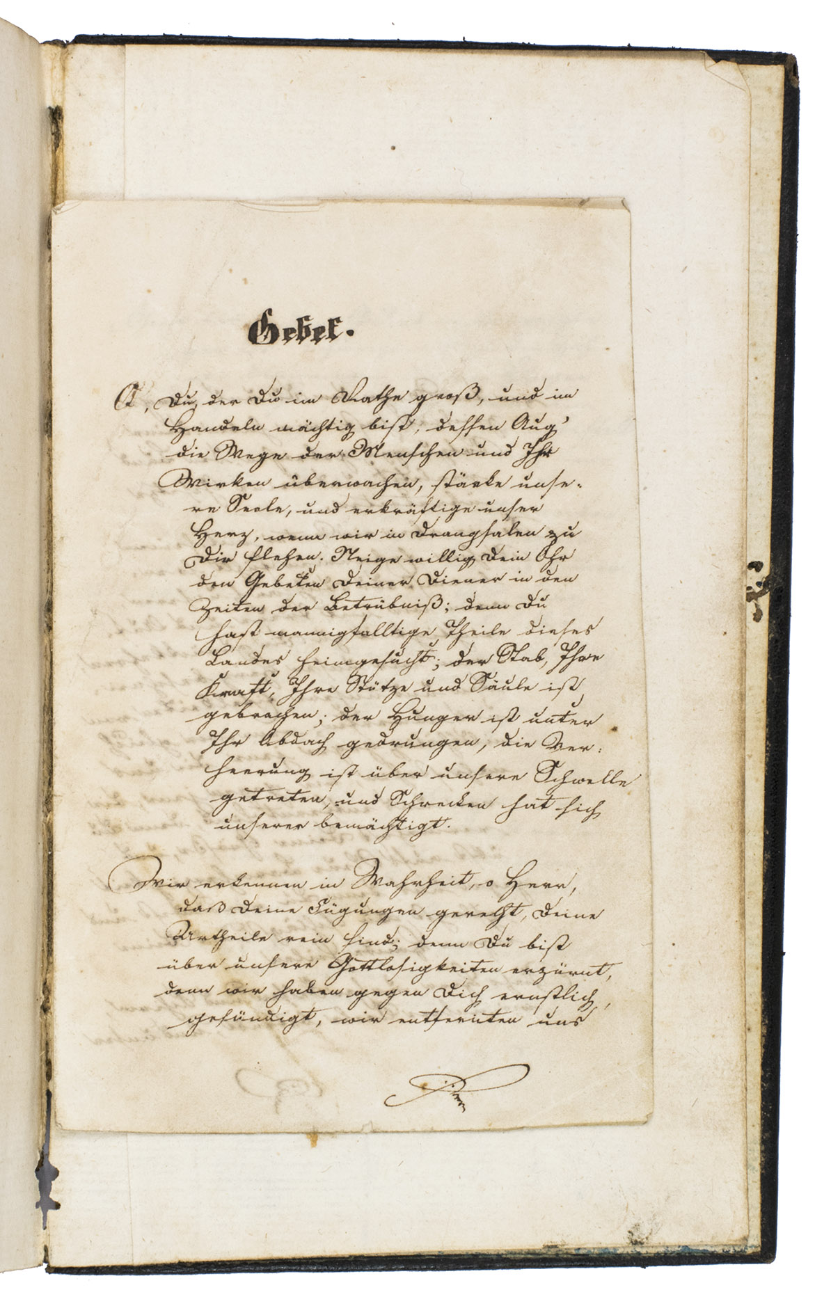 Beautifully calligraphed late-18th-century compilation of prayers based on the popular "Andachts- and Gebetbuchen" published in Germany in the 18th and 19th centuries. The present manuscript was written by Johann Karl Erbes, who clearly took much care in producing this work. It contains every kind of prayer needed for practicing faith in everyday life.