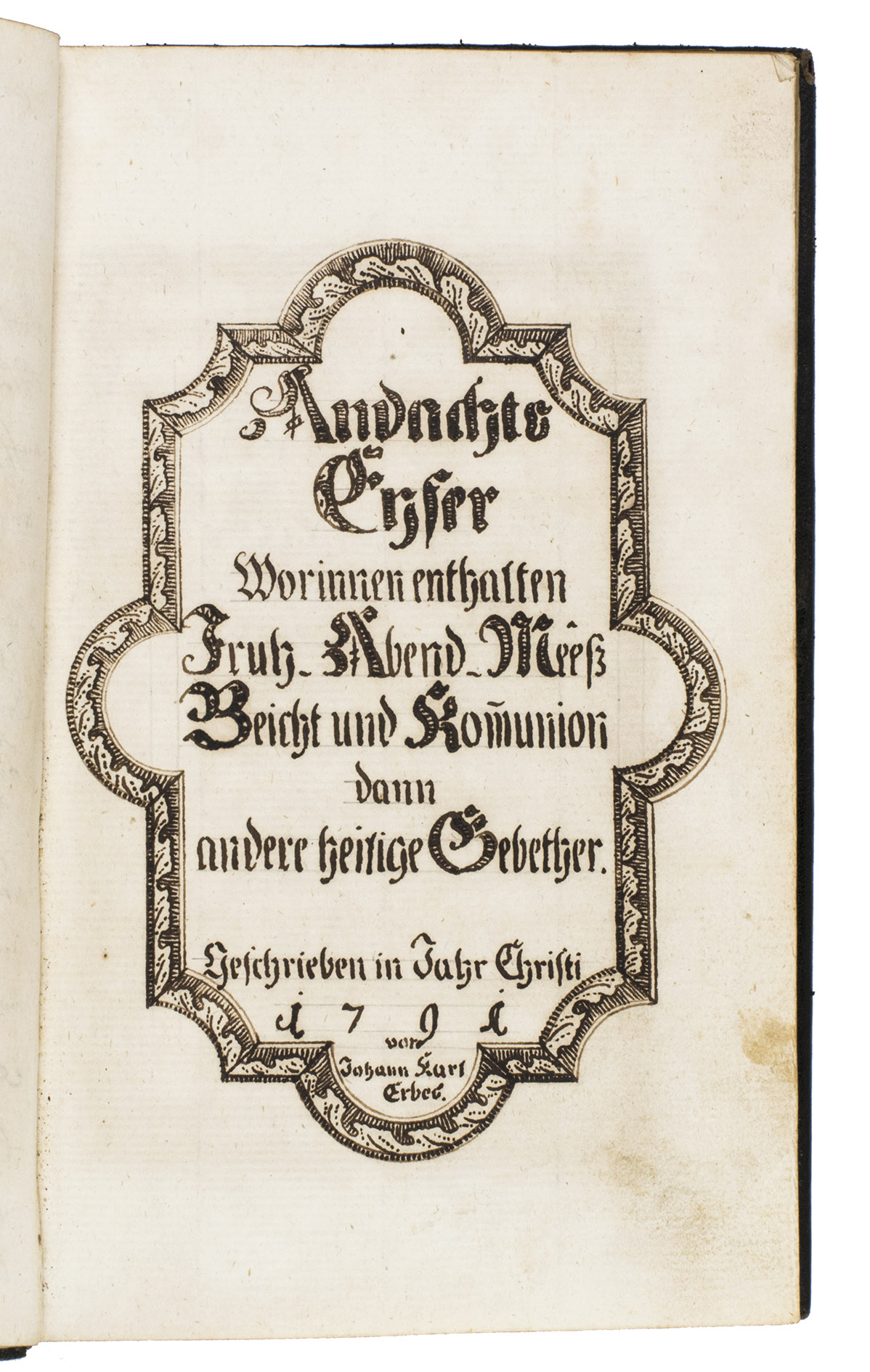 Andachts Eyfer Worinnen enthalten Fruh- Abend- Meess Beicht und Kommunion dann andere heilige Gebether. Geschrieben in Jaht Christi 1791 von Johann Karl Erbes.