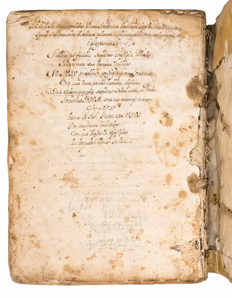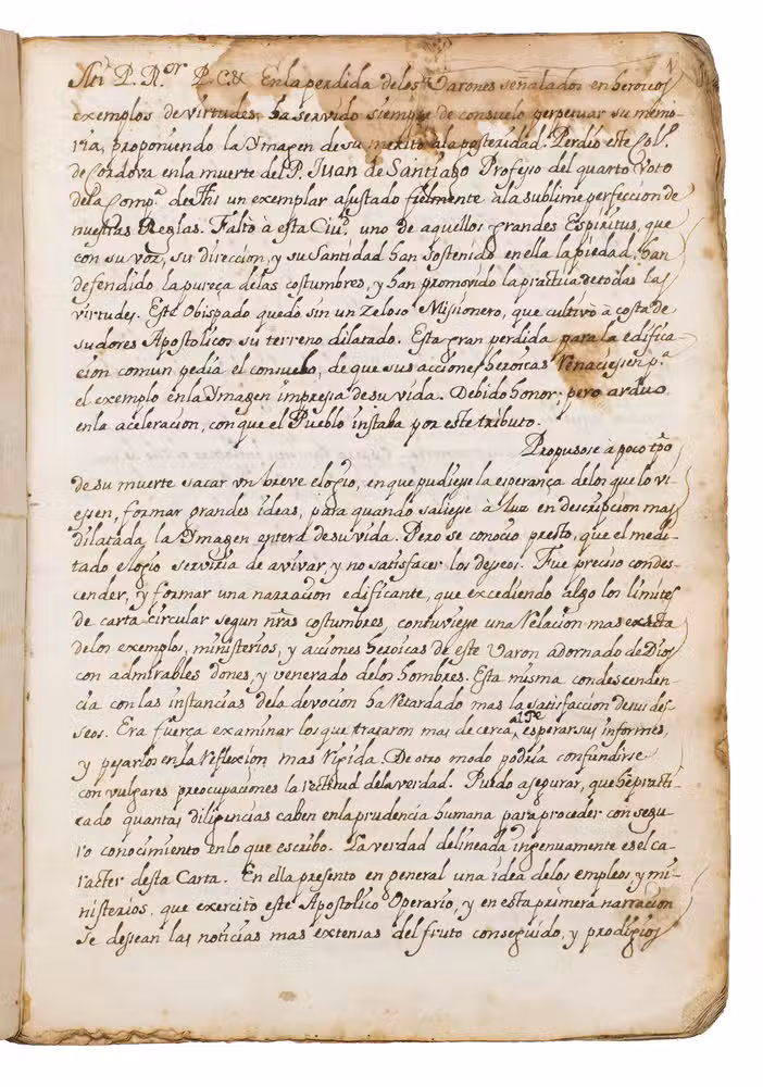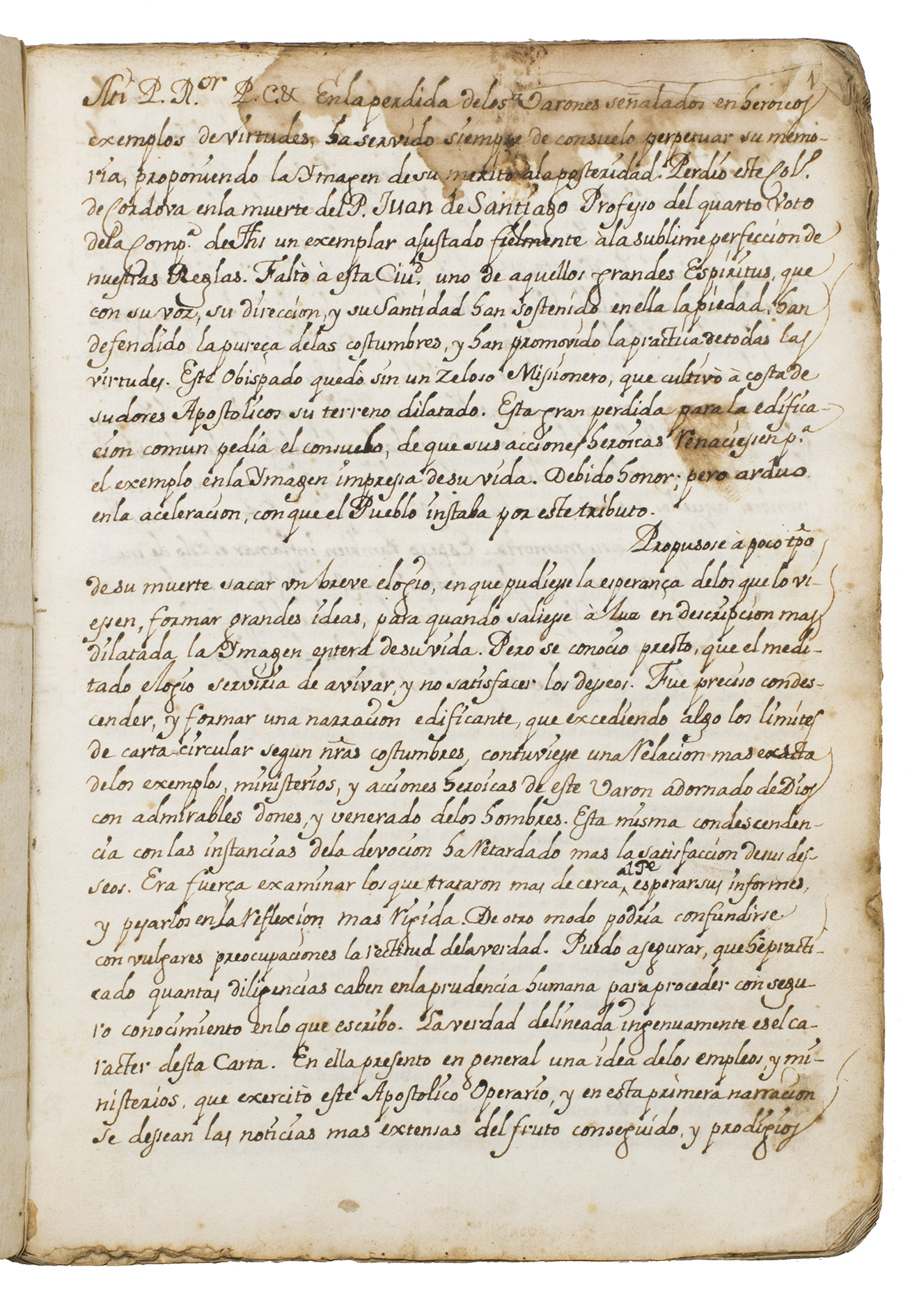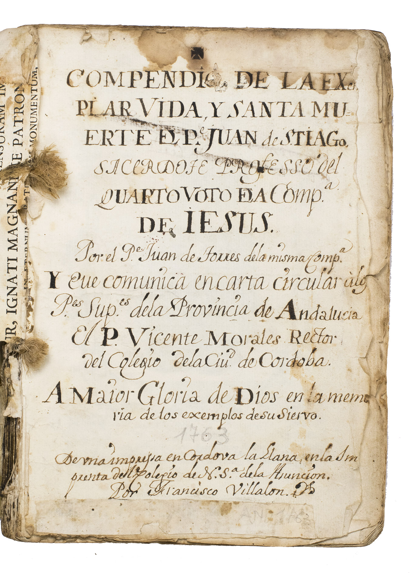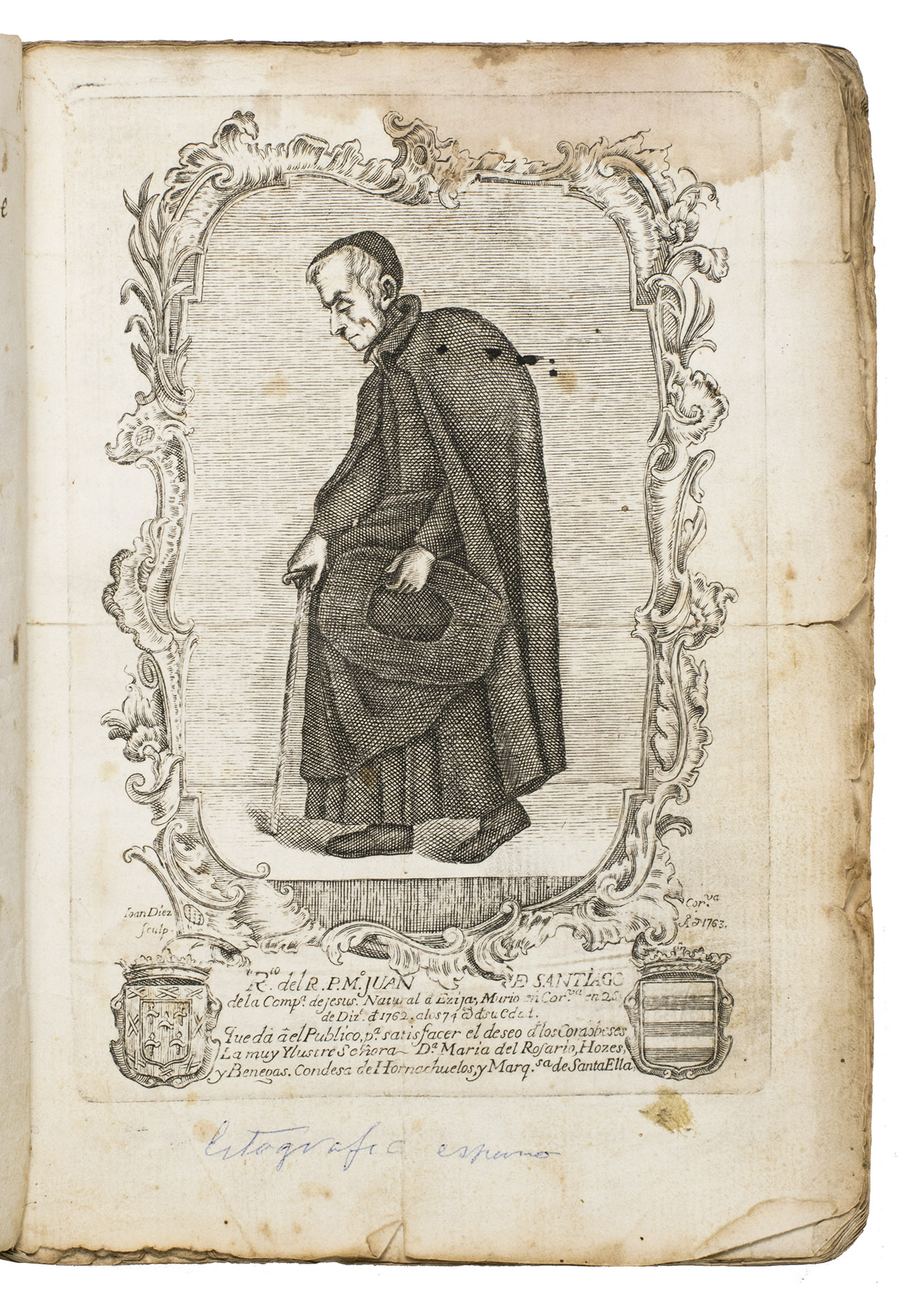 Manuscript version of the only contemporary source on the life and death of the Córdoban Jesuit Juan de Santiago (1689-1762). It follows a work by the same name by Vincent Morales (1708-1765), which was probably published for the first time in 1763 in Córdoba. The copper engraving in the present manuscript likely comes from this edition. Judging from the ownership annotation, the present manuscript was also made in Córdoba, probably for a local university or convent. It contains an extra paragraph at the end about a feast held in honour of Juan de Santiago, including six epigrams written for him. This part is not present in the printed versions of this work.