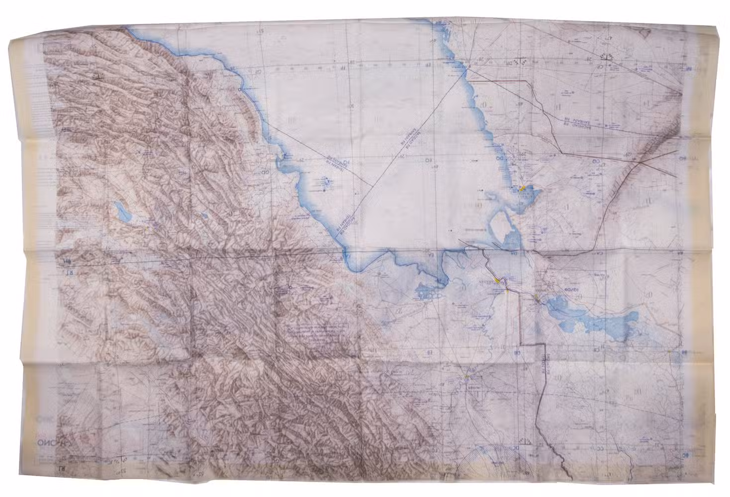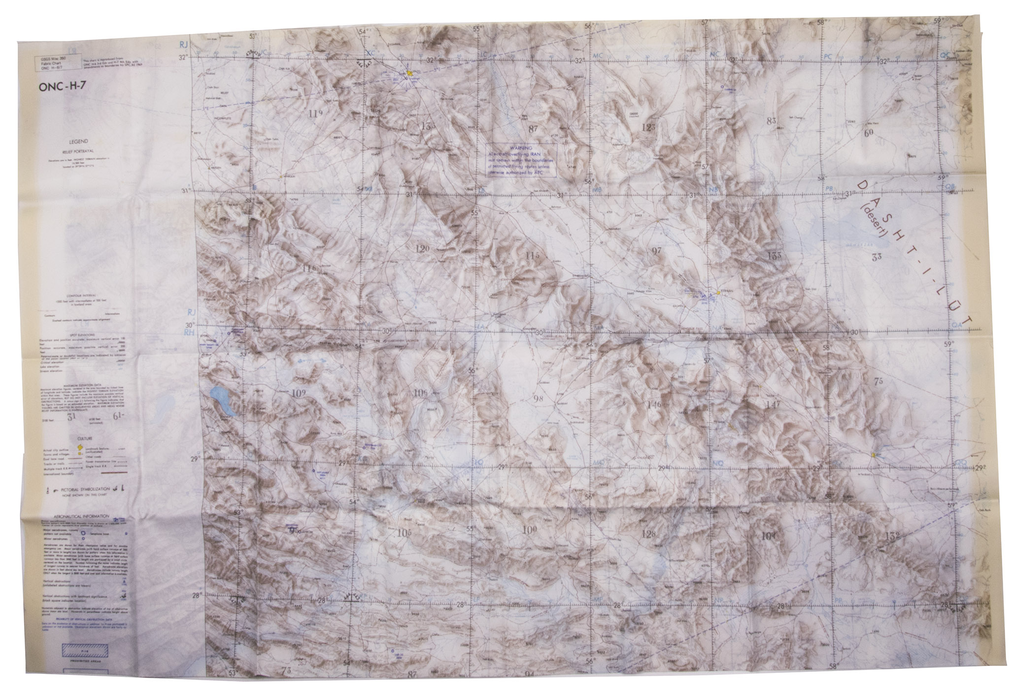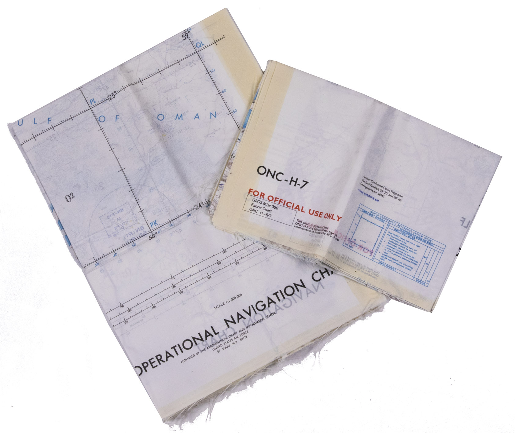 St Louis, Aeronautical chart and information center, United States Air Force, 1969. Two copies of two folding maps colour printed on both sides of a sheet of silk (103 x 78.5 cm) on a scale of ca. 1:1,000,000. The two maps (ONC-H-6 & ONC-H-7) show one continuous area.