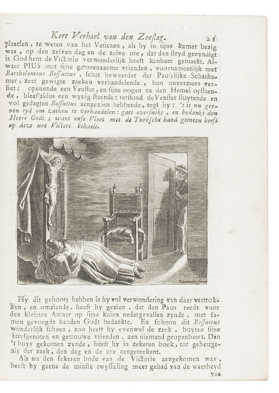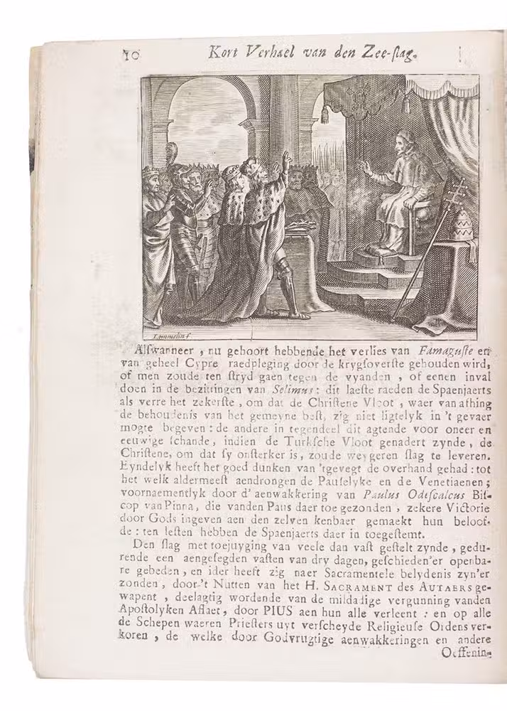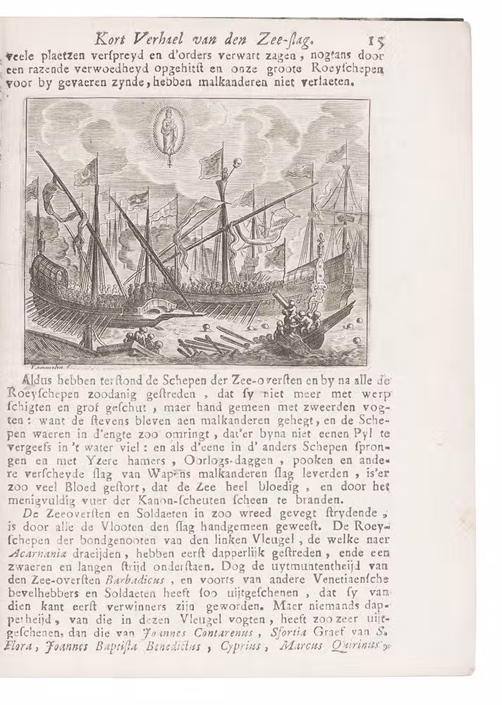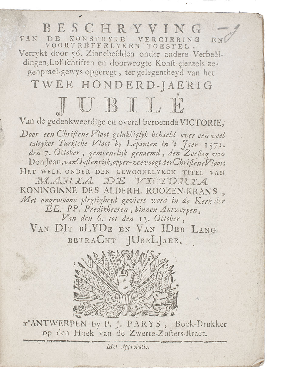 Rare work detailing the Antwerp Feast of Our Lady of Victory on 7 October 1771, commemorating the Battle of Lepanto (7 October 1571), where the Holy League famously defeated the Ottoman fleet off the coast of western Greece. It opens with an account of the battle, followed by detailed descriptions of the commemorative festivities.