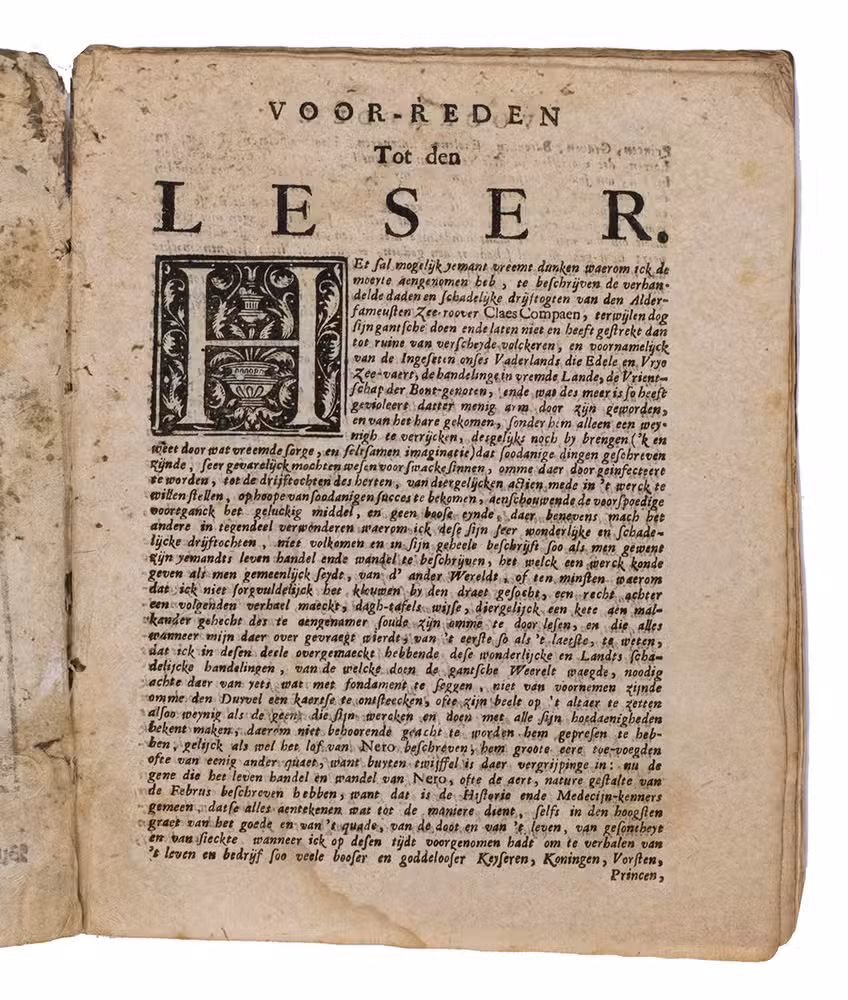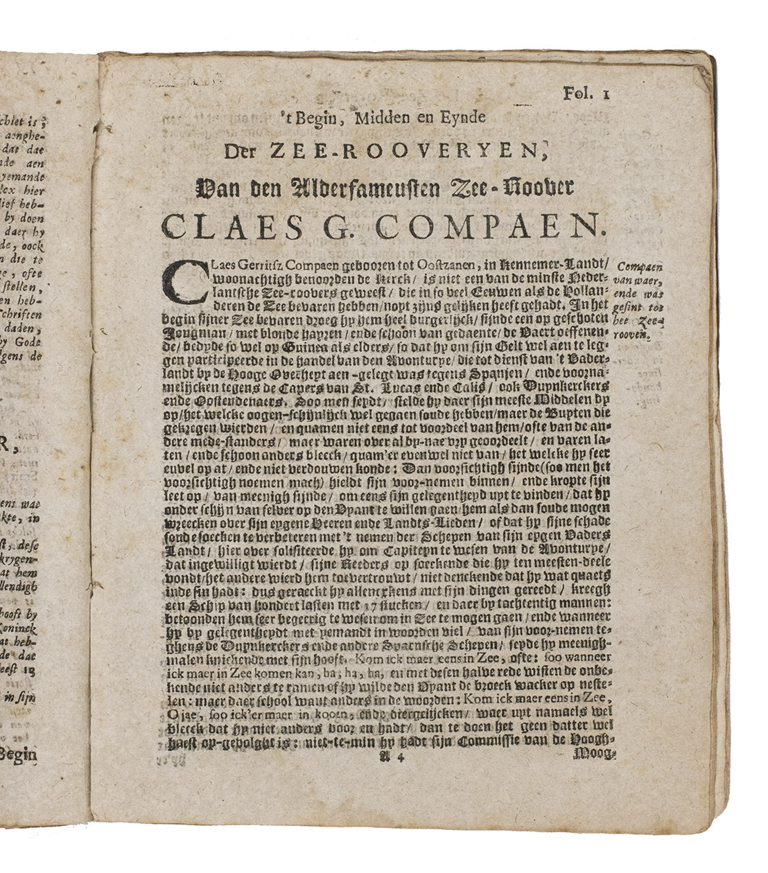Very rare 17th-century edition, in the original Dutch, of the history of the famous Dutch privateer Claes Compaen (1587-1660). He was born at Oostzaan in the Netherlands and started his career as a merchant, but soon became undoubtedly the most daring and notorious Dutch pirate of his day, especially active around 1620. For three years, he hijacked ships in the English Channel, the Mediterranean, the Caribbean and off the coasts of Africa, America and the West-Indies.