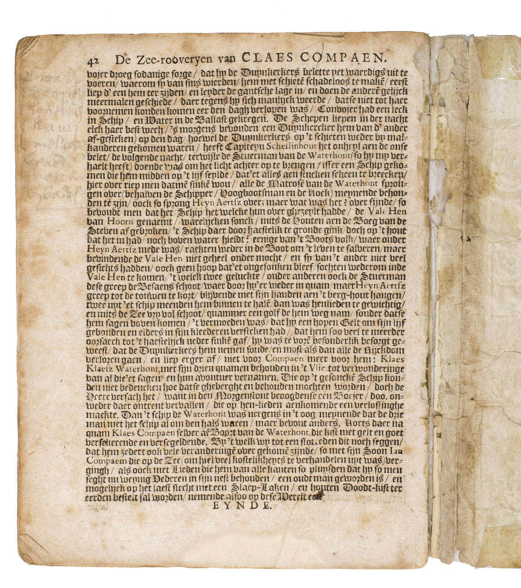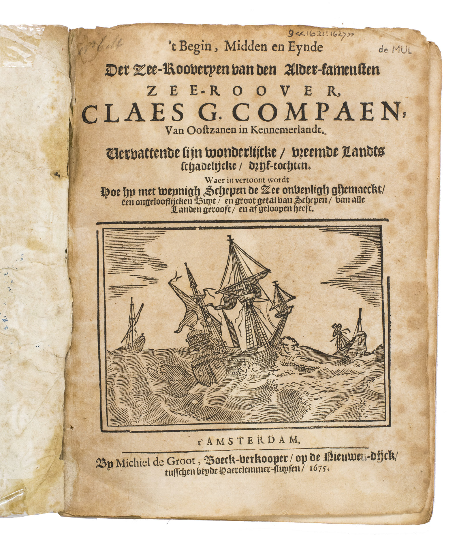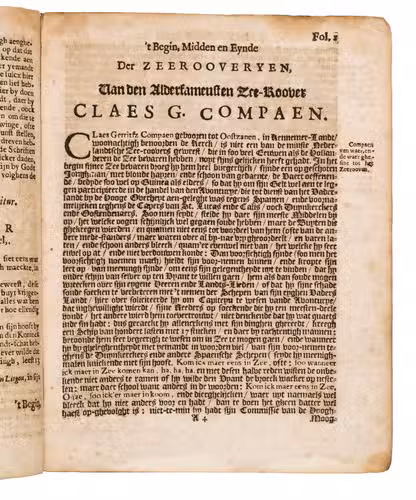 't Begin, midden en eynde der zee-rooveryen, van den alder-fameusten zee-roover, Claes G. Compaen, van Oostzanen in Kennemerlandt. vervattende sijn wonderlijcke, vreemde landts schadelijcke drijf-tochten. waer in vertoont wordt hoe hy met weynigh schepen de zee onveyligh ghemaeckt, een ongelooflijcken buyt, en groot getal van schepen, van alle landen gerooft, en af geloopen heeft.