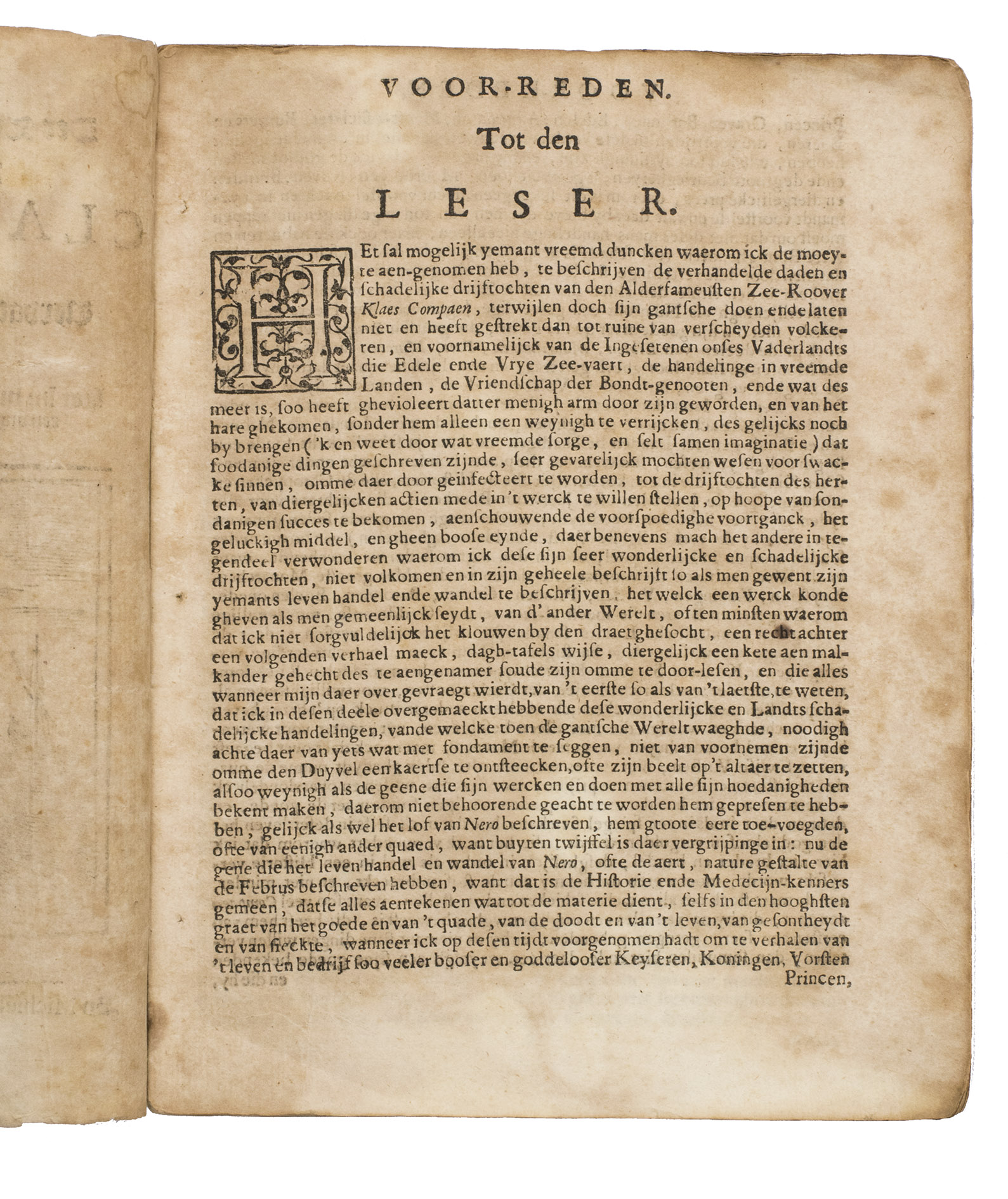 Very rare 17th-century Dutch edition of the earliest published biography devoted entirely to a pirate, and one of the most vivid narratives of maritime freebooting to emerge from the Dutch Golden Age.