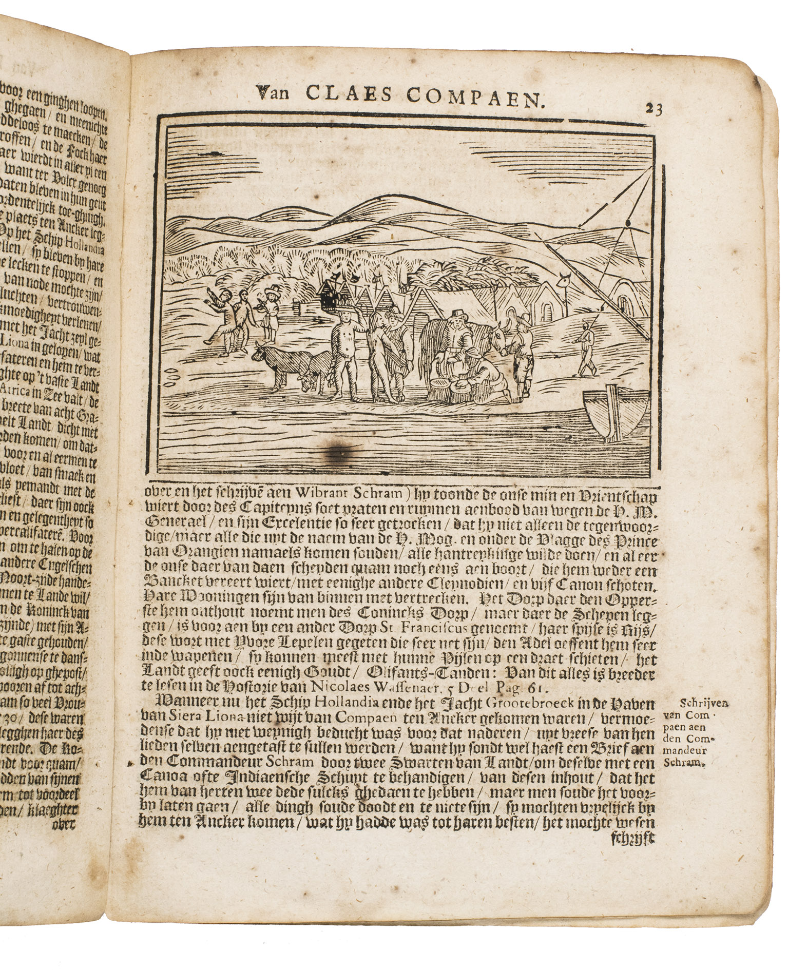 With a black oval library stamp of "Missie Huis Arnhem" in the bottom outer corner of the front wrapper, the number "9<<1621:1627>>" in the top margin of the front wrapper and the title page, an ownership stamp of "de Mul" on the inside of the front wrapper and on the title page, and a small bookplate of "Librairie ancienne et mod Nartinus[!] Nijhoff La Haye" mounted on the inside of the front wrapper. The paper wrapper is worn, the spine has previously been stengthened with black paper/tape, the whole is now covered with protective clear tape. Slight foxing and browning throughout, with a small tear in the outer margin of pp. 39-40 (not affecting the text). The present work is complete, but leavs in the final quire have been mis bound: p. 30 is followed by pp. 35-38, 31-34, 39-42. Buisman 116; Lunsford, Piracy and Privateering in the Golden Age Netherlands (2005), pp. 161-163; STCN 097051624 (1 copy); USTC 1811907 (1 copy); WorldCat 951918594 (6 copies); cf. Cat. NHSM, p. 897 (1659 ed.); Muller, America 2131; Muller 839-840 (other eds.); Sabin 15015 (1663 & 1685 eds.); Scheepers II, 1026; Tiele, Mémoire, pp. 248-249; Waller 218 (all ed. 1662).