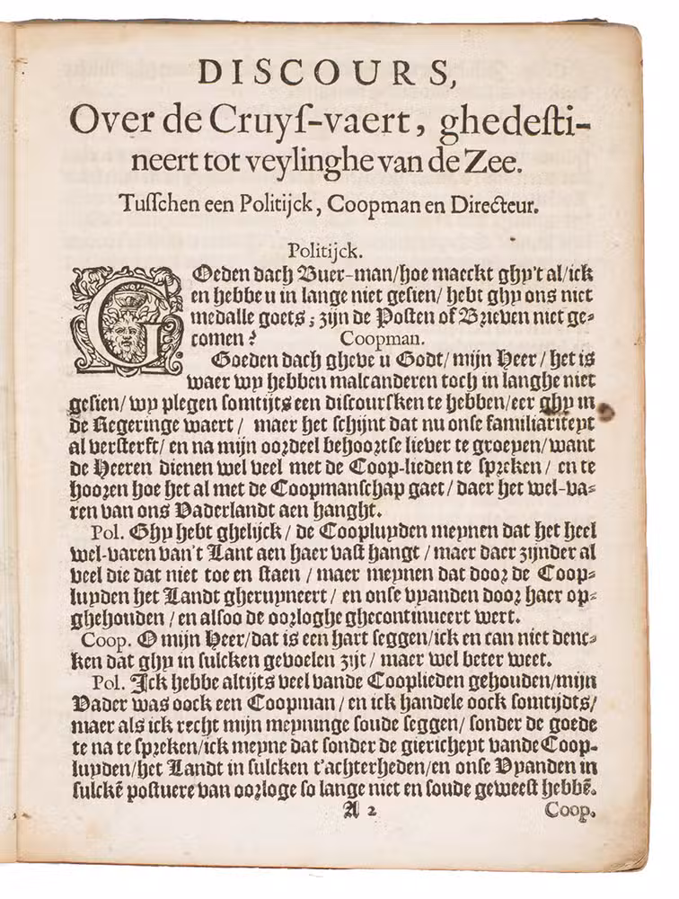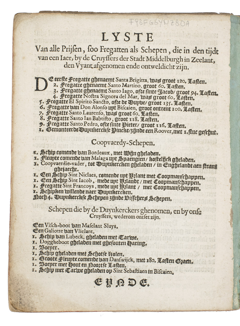 Two dialogues discussing Dutch warships capturing Dunkirk privateers and merchant ships. Dunkirkers, serving the Spanish Navy, were a major threat to Dutch trade and shipping, taking hundreds of ships during the Dutch revolt. The present pamphlet discusses several commanders of warships, including the Zeeland captains Jacob Pense, Gerrit Verhagen, Jan Evertsen de Jonge and Jacob Verhelle, who captured no fewer than 30 Dunkirk ships in just one year. Jan Evertsen de Jonge was the son of the famous admiral Jan Evertsen, who had captured the infamous Duinkerk privateer Jacques Colaert in 1636 and later fought several battles in the first and second Anglo-Dutch war. The pamphlet concludes with a list of captured ships mentioned in the text. It seems to have been written to advocate the fitting out of more warships to protect Dutch (or more particularly Zeeland) trade.