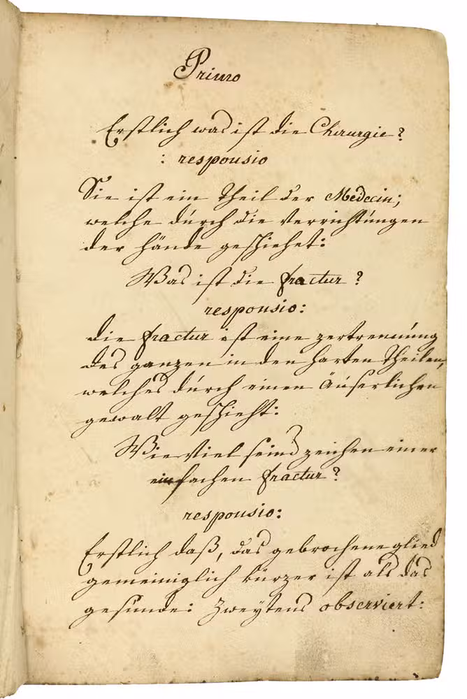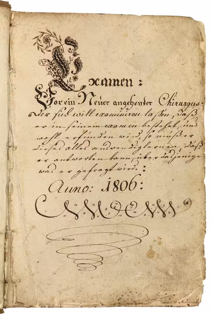 Examen: vor ein neuer angehender Chirurgus, der sich will examiniren lassen, daß er in seinem examen bestehet, und wohl erfunden wird, so muß er dieses alles auswendig lernen, daß er antworten kann, über dasjenige was ihm gefragt wird. Anno 1806.