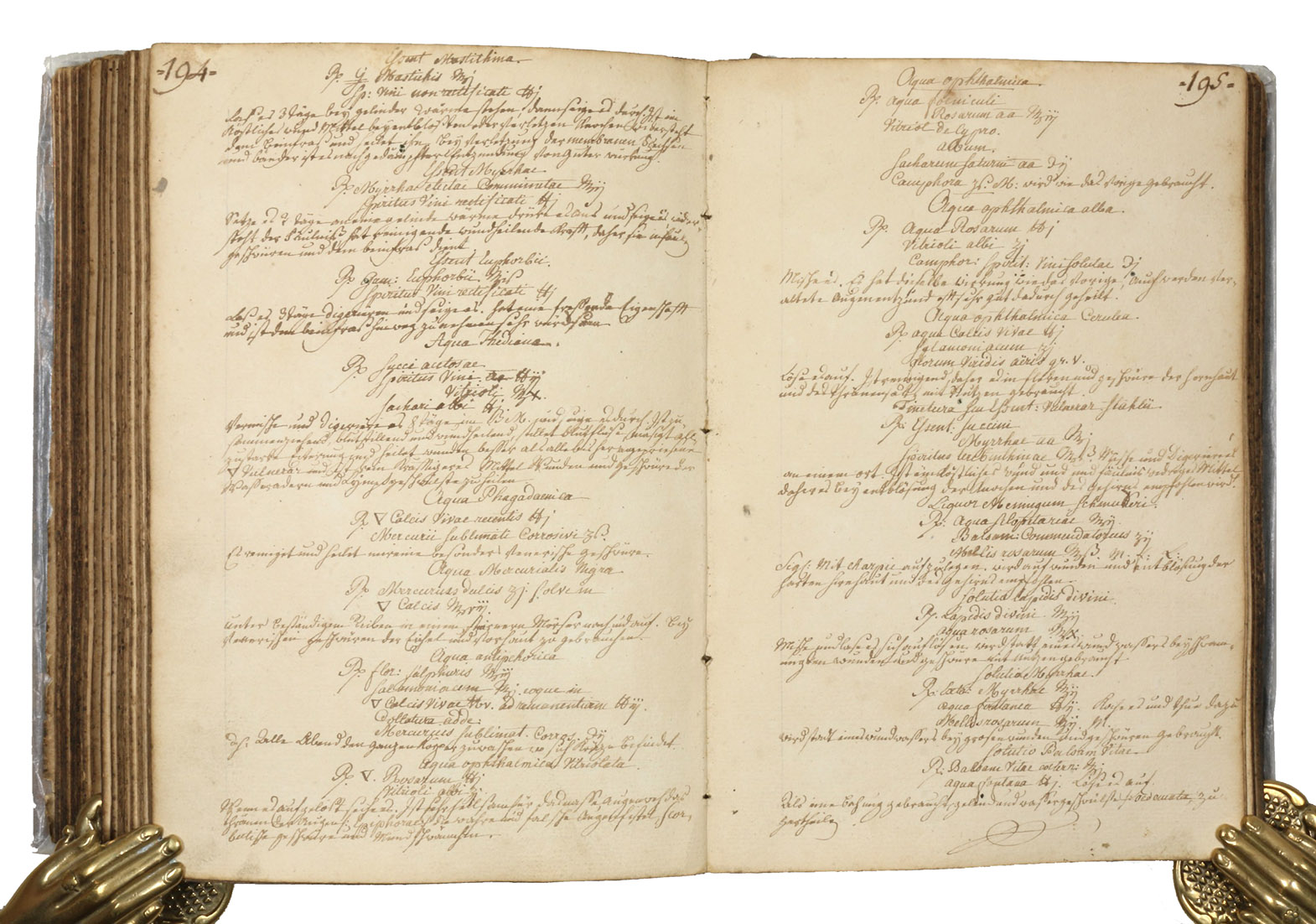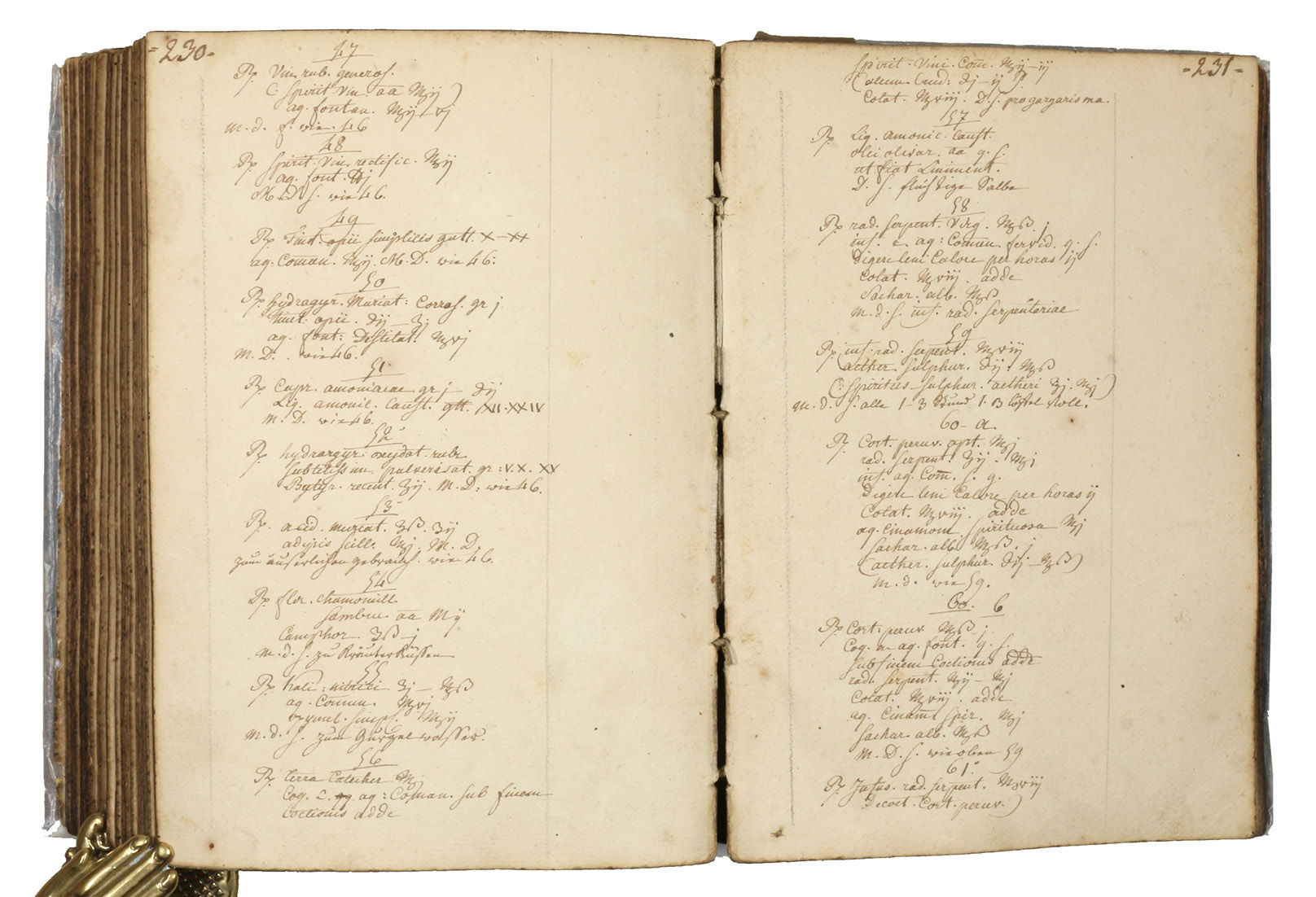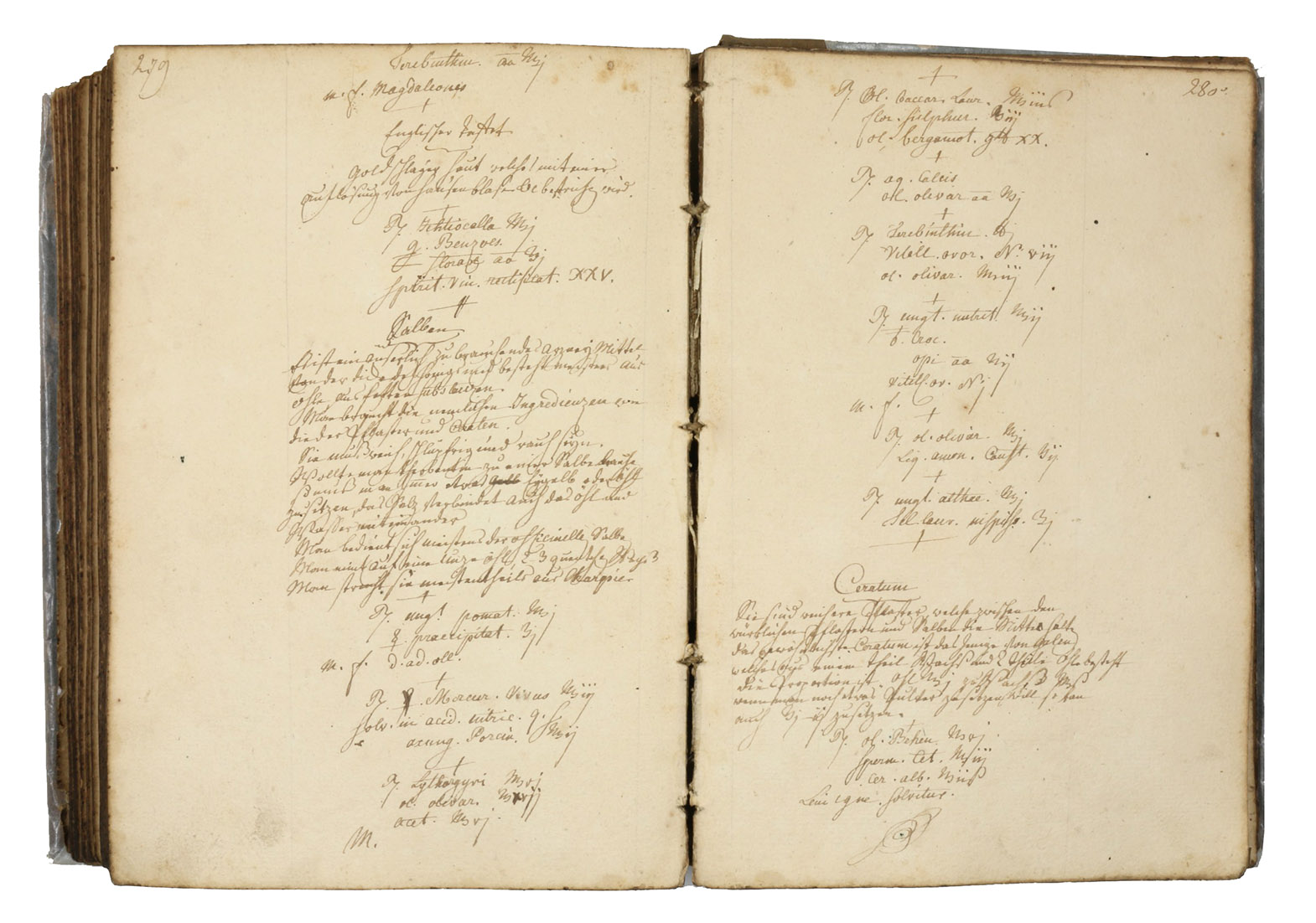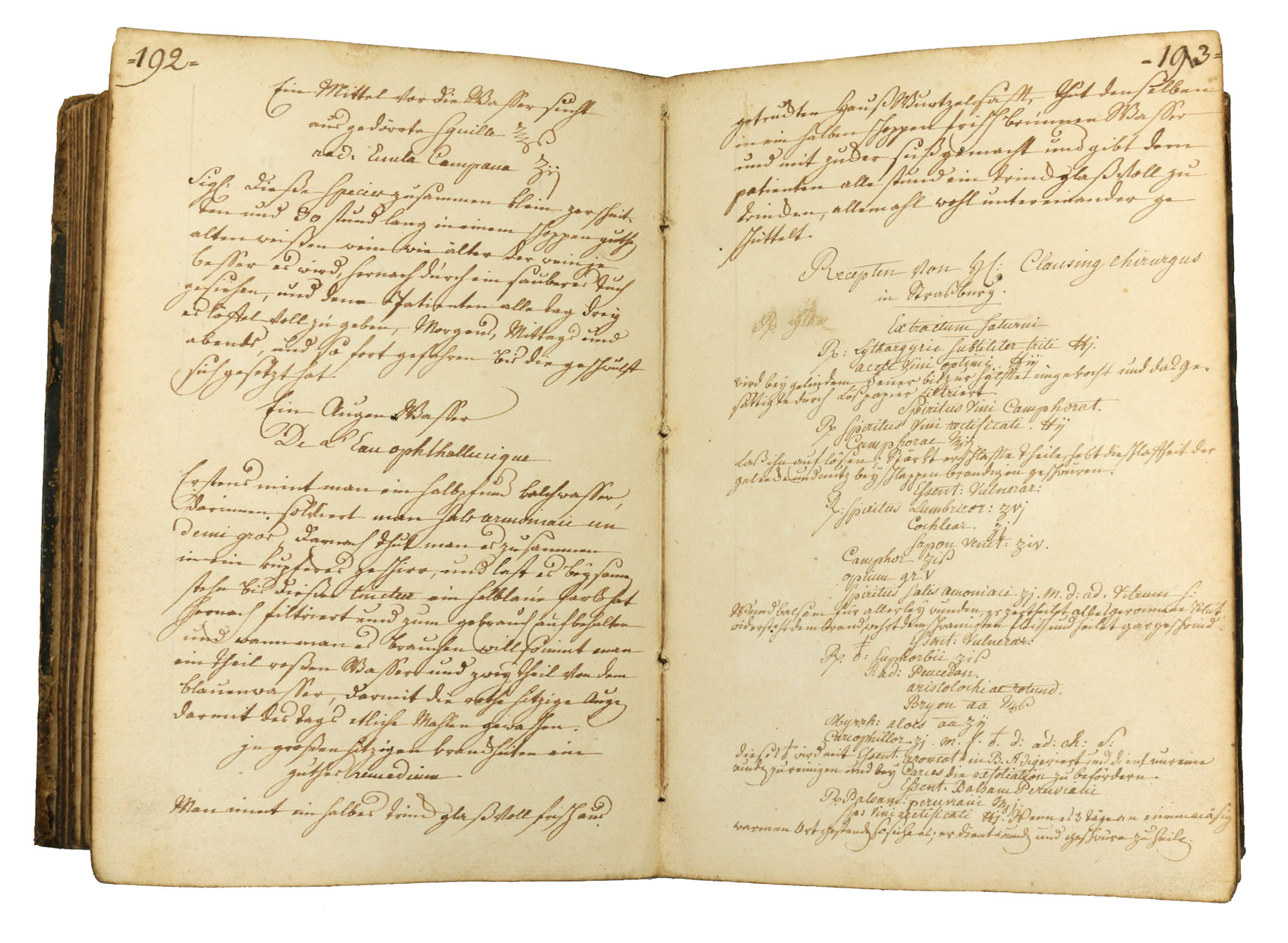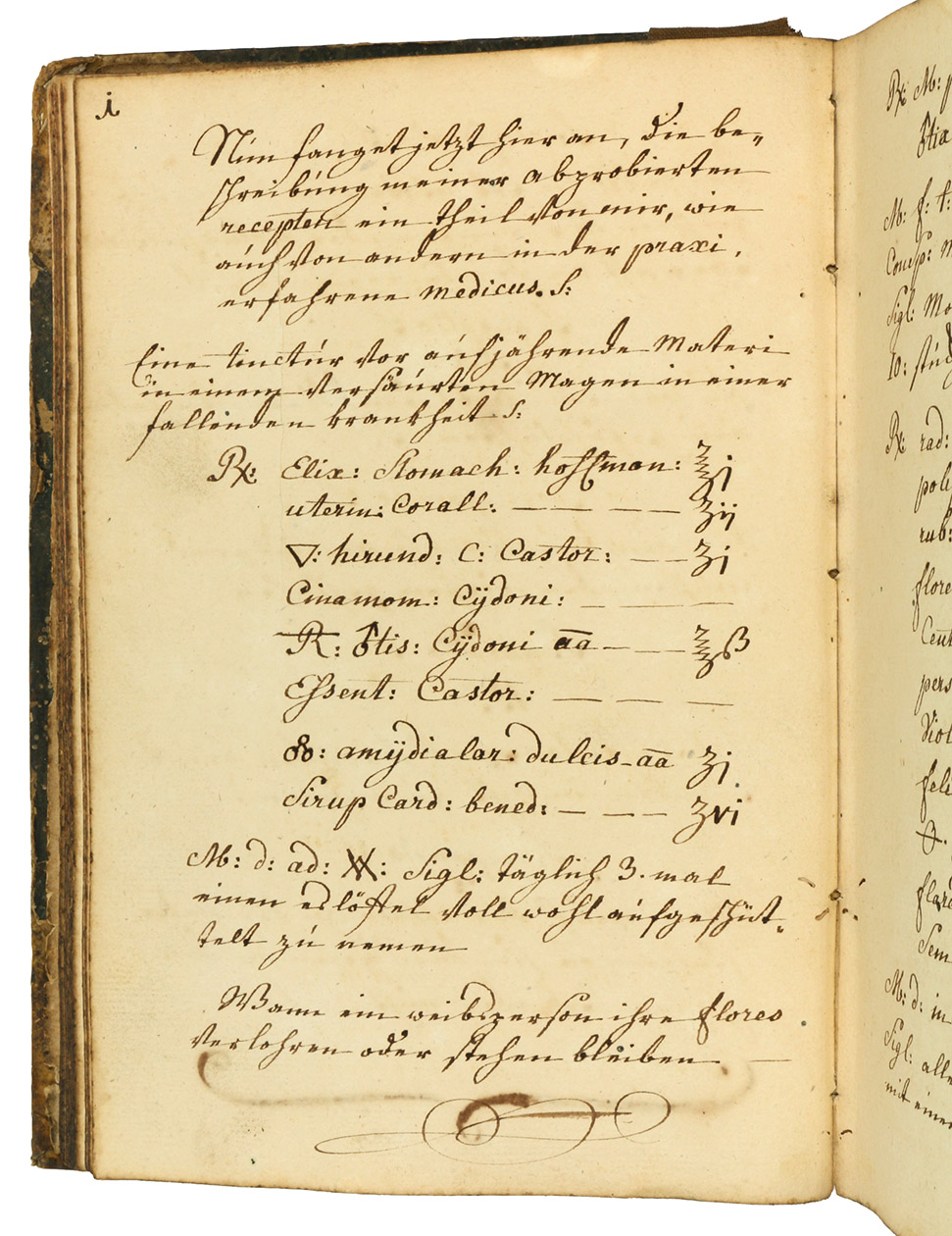 Interesting medical manual beginning with an "examen" on the unnumbered 45 preliminary pages, arranged as questions and answers in the manner of a catechism. The body of the work consists in a copious collection of medical recipes: the first 193 pages contain a "description of my approved recipes, some by myself, as well as by other medical men well versed in practical matters". The next section (up to p. 223), in a different hand, contains additional "recipes by Mr. Clausing surgeon in Strasbourg" (i.e. the Baden-born surgeon and obstetrician Johann Peter Clausing, 1762-1835); the following section (to p. 242) contains "recipes by Dr. Hessert" (another Strasbourg physician of the early 19th century). Pages 243-286 offer "formularies" (such as Hippocrates, de Arte &c.), but also recipies for ointments, preserves, pills, pastes, rotulae, dicocta, clismata, pulpae, cataplasmata, etc.