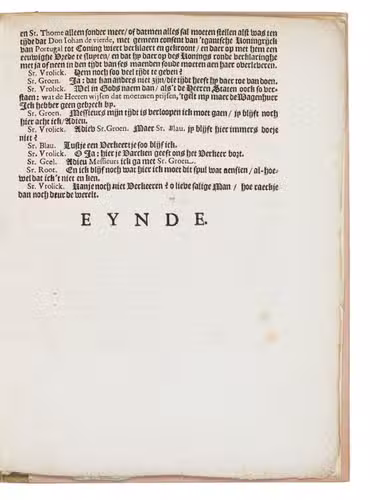 The men discuss the latest news concerning Brazil, including the Zeeland privateers, the sugar trade, the establishment of the Portuguese Brazil Company (Companhia Geral para o Estado do Brazil), and the causes of the failure to make peace with the Portuguese. They also discuss the poor position of the WIC and suggest it would be better to revoke the Company's monopoly and allow merchants free trade with Brazil.
