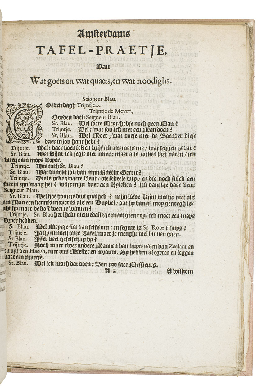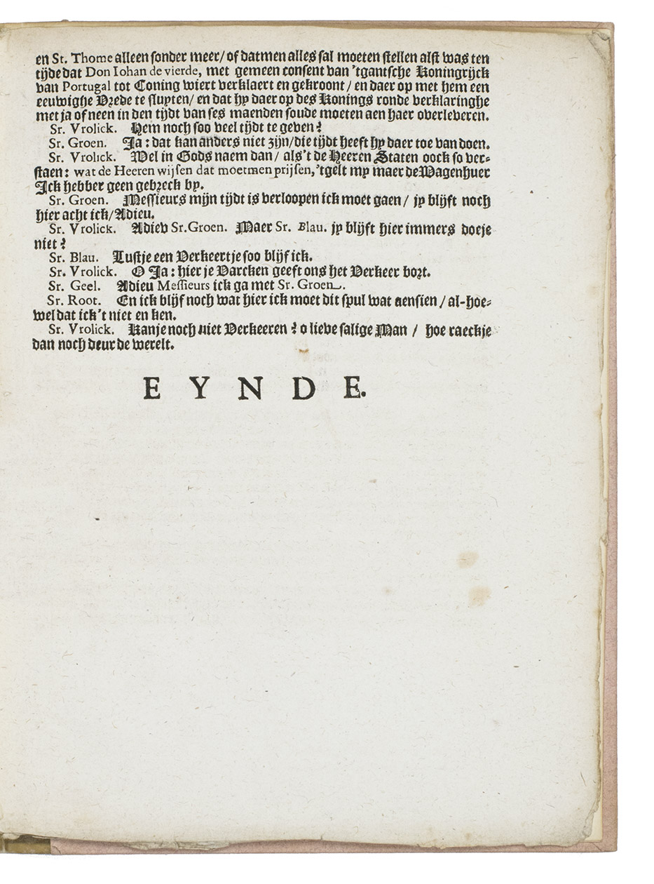 First and only edition of a pamphlet on the strife in Brazil between the Dutch West India Company (WIC) and Portugal, in the form of a dialogue between four Dutchmen and a bartender in an Amsterdam tavern. It is one of a series of anonymous pamphlets published on the subject in that year, "much superior to anything which had as yet been written on the subject" (Asher, p. 197).