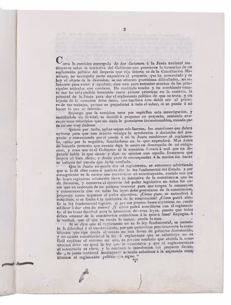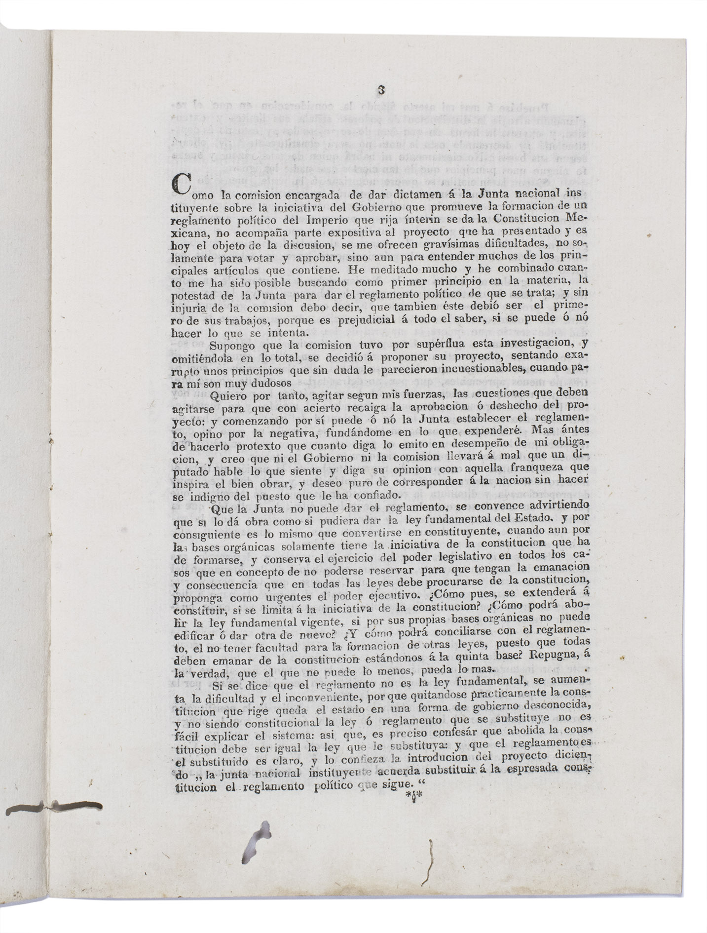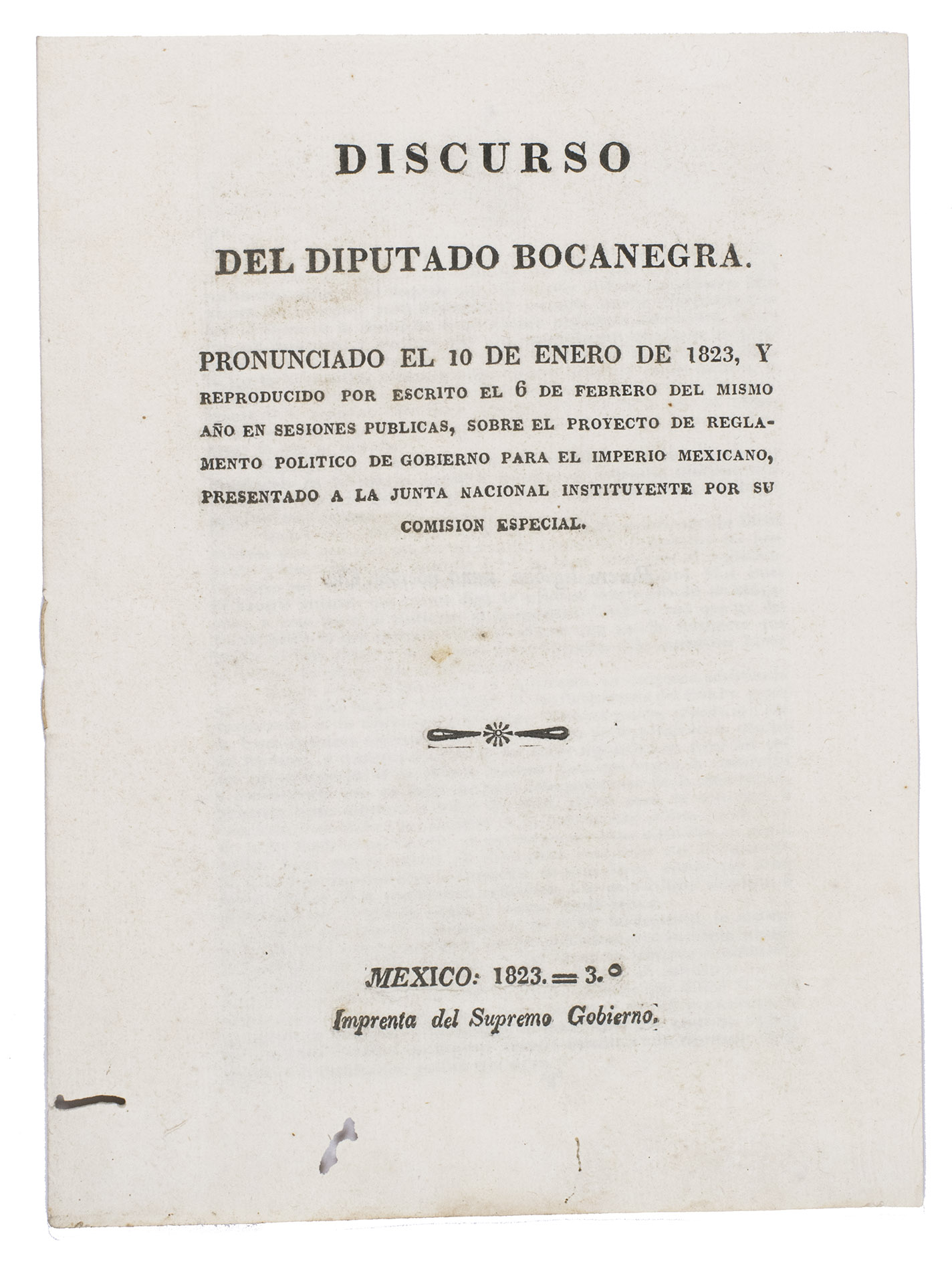 Very rare first edition of an important speech, which forms part of the preliminary draft of the 1824 Mexican Constitution. It was delivered by José María Bocanegra (1787-1862), a notable lawyer and politician, on January 10, 1823, during the public sessions of the National Institutional Junta. This Junta has been installed by the controversial Emperor Agustín I (1783-1824) after he had dissolved congress in November 1822. Bocanegra opposed the emperor and his actions. In the speech, he therefore presents the "Proyecto de Reglamento Político para el Imperio Mexicano", a political framework that aimed to define the political structure of the newly independent country. Bocanegras vision significantly influenced the debates that eventually led to the drafting of Mexicos Constitution of 1824. The present speech is therefore recognised as one of the foundational texts for its creation.