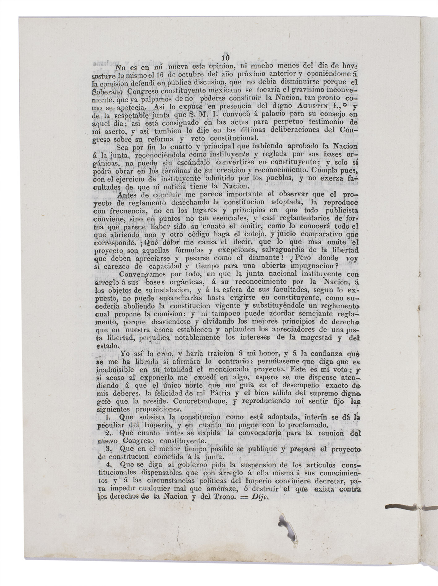 Mexico City, Imprenta del Suprema Gobierno, 1823. 4to. Stitched through 3 holes. 10, [2 blank] pp.