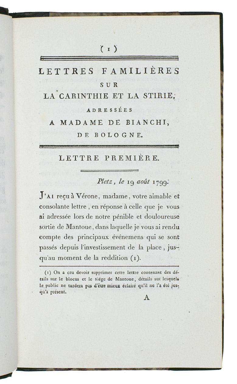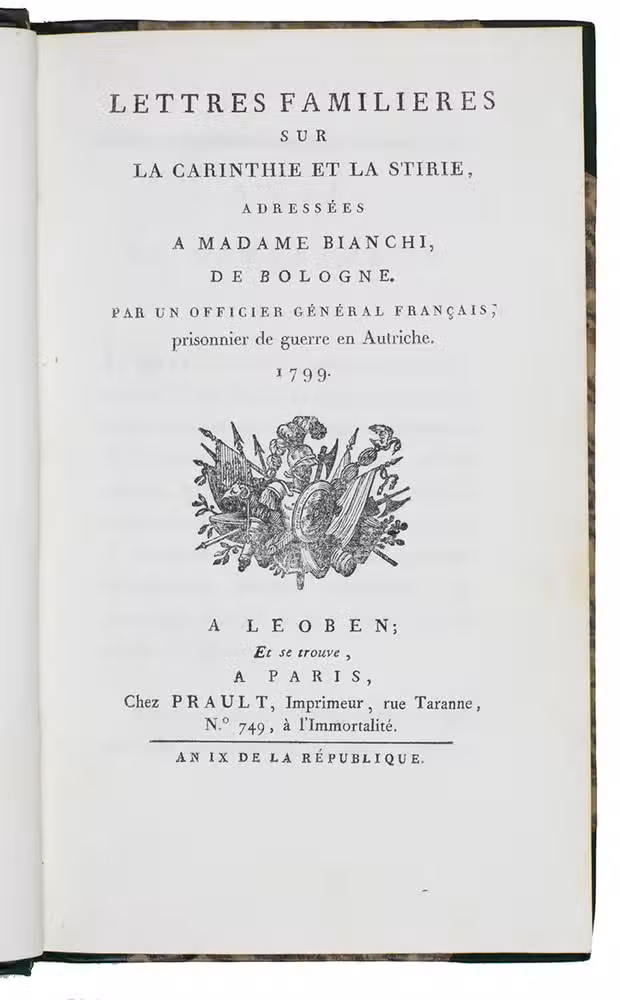 Lettres familieres sur la Carinthie et la Stirie, adressées a madame Bianchi, de Bologne. Par un officier général Français, prisonnier de guerre en Autriche. 1799.