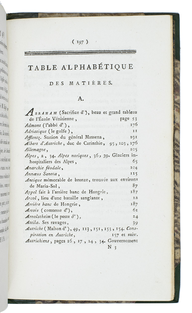 Leoben (Austria) and Paris, Louis-François Prault, an IX [= 1800/01]. 8vo. With a woodcut vignette on the title-page. Contemporary green half calf, gold-tooled spine. [8], 208 pp.