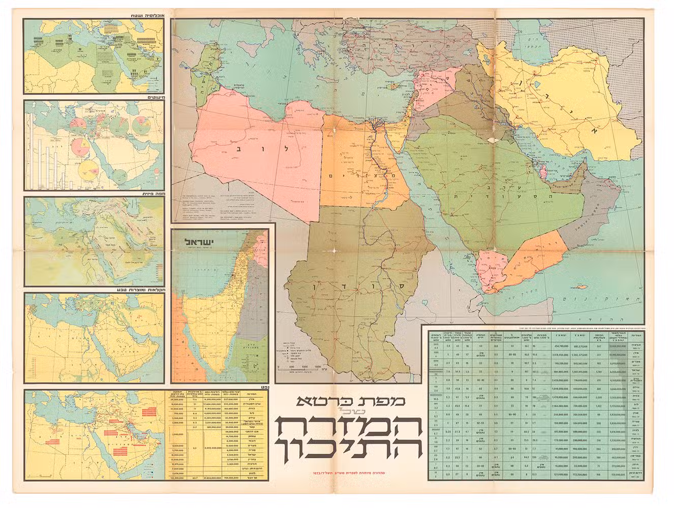 A large wall map of the Middle East shortly before the Yom Kippur War, showing the Arabian Peninsula, north-eastern Africa with Libya, Egypt and Sudan as well as Turkey and Iraq pictured in their entirety. A separate inset shows Israel, others show statistics such as population and trade, oil production, etc.