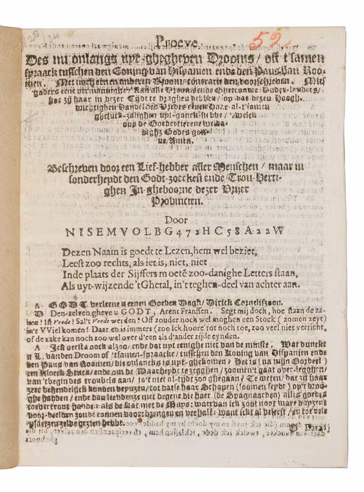 Proeve des nu onlangs uyt-ghegheven drooms, oft t'samenspraack tusschen den coningh van Hispanien ende den Paus van Roomen. Met noch eenen anderen droom, contrarie den voorschreven. Mits gaders eene vermaninghe, aan alle vroome ende ghetrouwe vader-landers, hoe zij haar in dezer tijdt te draghen hebben (...). Beschreven door een lief-hebber aller menschen, maar in sonderheydt den Godt-zoeckeñ ende trou-hertighen in gheboorne dezer vrijer provincien. Door NISEMVOLBG472HC58A22W.