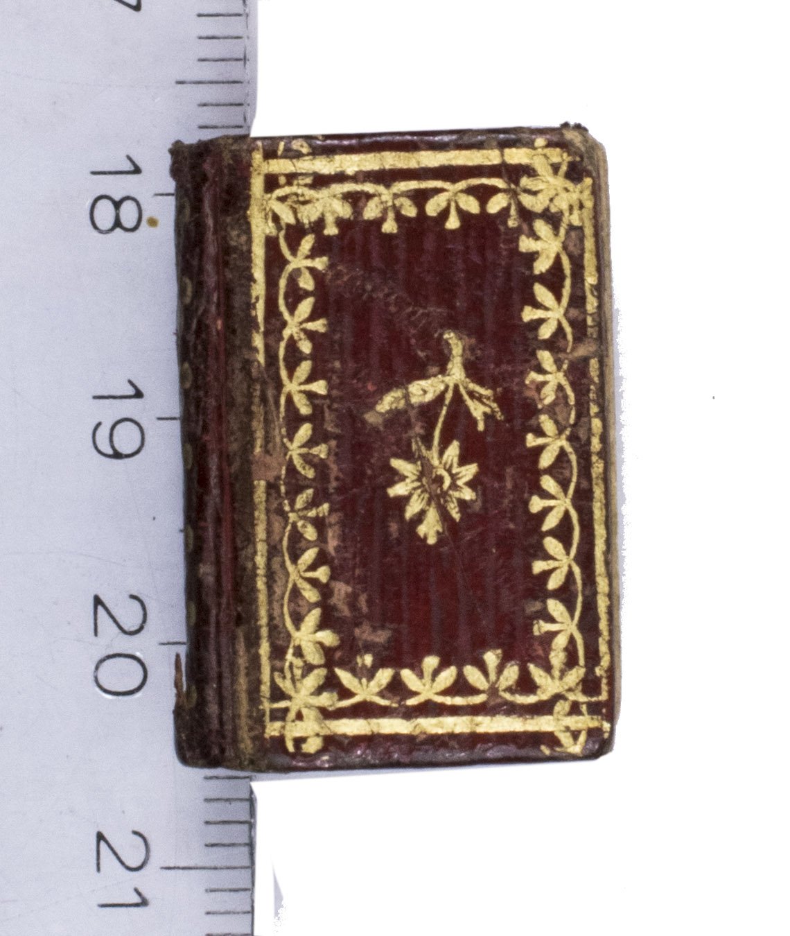 Paris, [chez Louis Janet, 1818]. 128mo (ca. 2.7 x 1.7 cm). With 8 full-page engravings. Original publisher's gold-tooled red morocco, with an upside down fleuron in the centre of both boards, surrounded by a vegetal border, gilt edges. 64 pp.