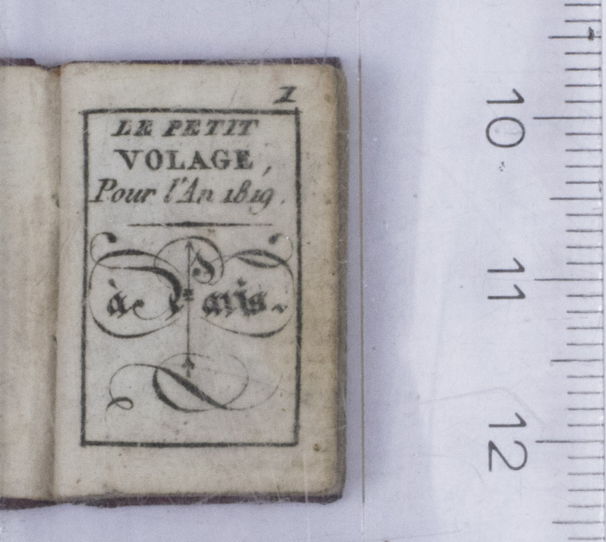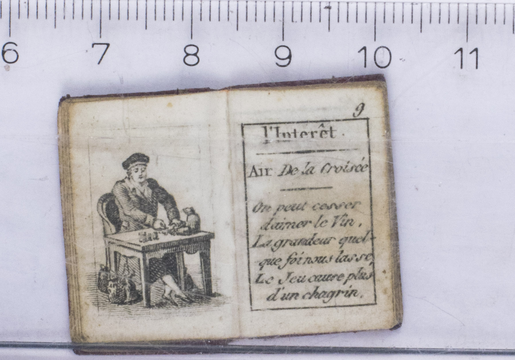 Beautiful miniature almanac for the year 1819, published by Janet, one of the most well-known producers of miniature books of his time. The work is a so-called "almanach chantant", a miniature almanac of less than 3 centimetres in size, with 64 pages, and illustrations. Typically intended for women, they were usually beautifully bound and contained poetry and love songs. The present example, which has curiously been bound upside down, contains several illustrated love songs, some of which are allegorical, and a calendar. The illustrations depict men and women engaged in a variety of different activities, dressed in the fashion of the time. Several issues of the almanac were published in the same year, with a different number of illustrations, and some with the publisher's name on the title page.